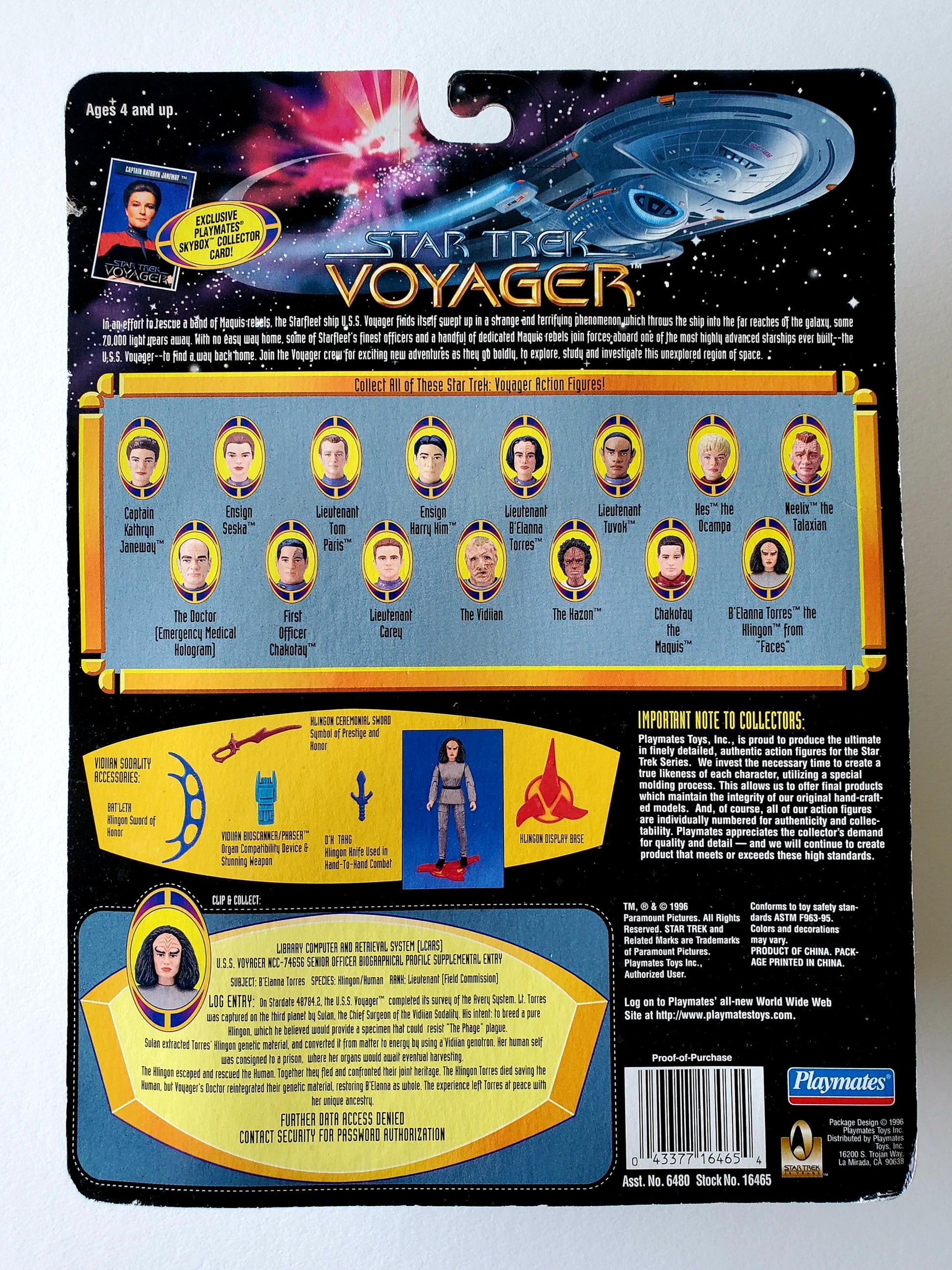 This figure of B'Elanna Torres the Klingon is based on the character from the Star Trek: Voyager television series. The package includes a Vidiian bioscanner/phaser, a Bat'leth, a D'k Tahg, a Klingon ceremonial sword, and a Klingon display base.