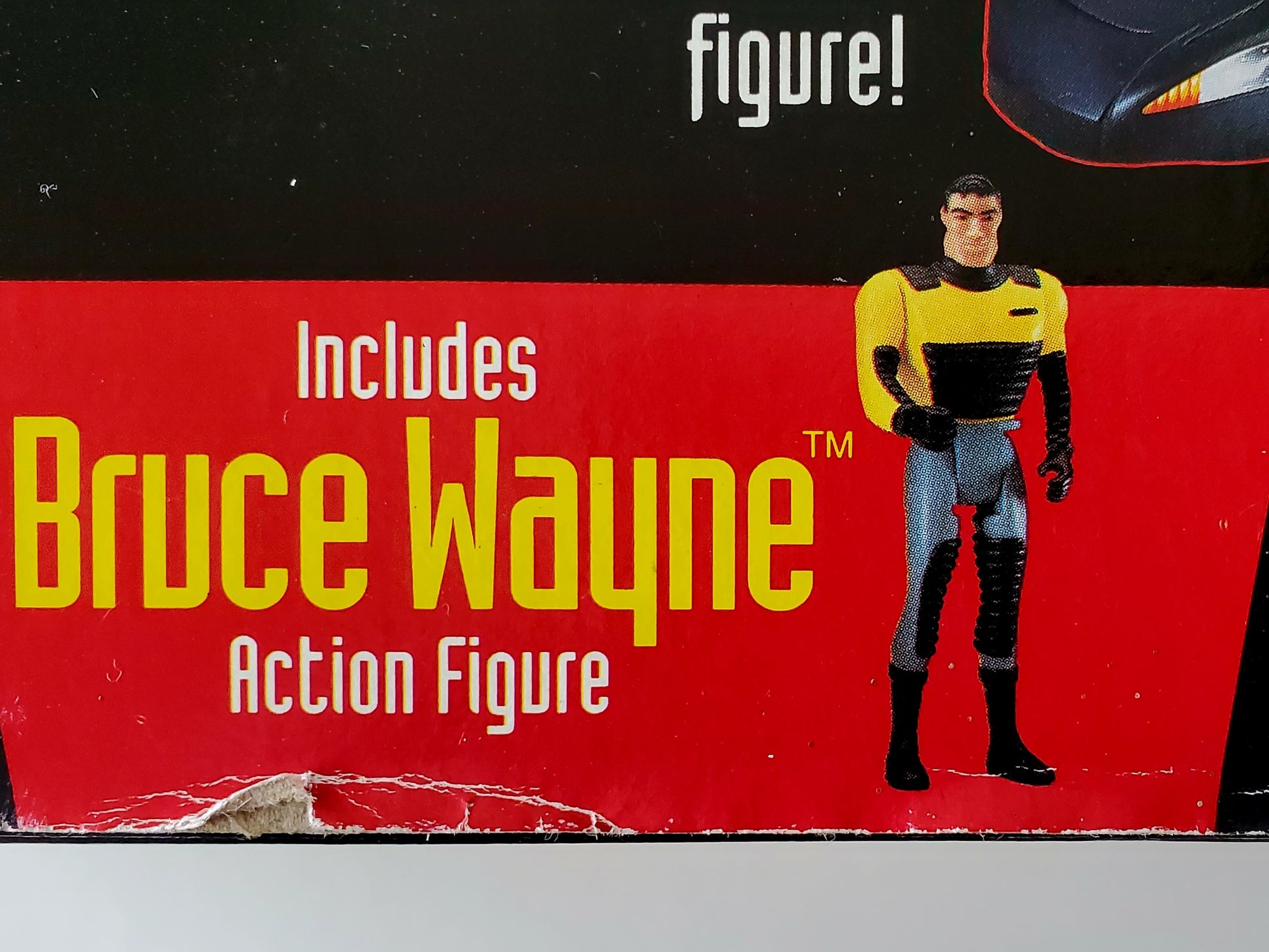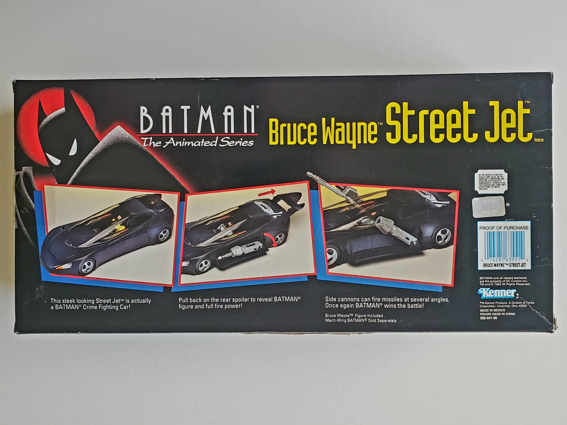 This vehicle from 1993 is based on the Batman: The Animated Series. The street jet converts to Batman's crime fighting car when the rear spoiler is pulled back. This reveals a second Batman figure (sold separately) and firing missile cannons. This set includes an exclusive Bruce Wayne action figure.