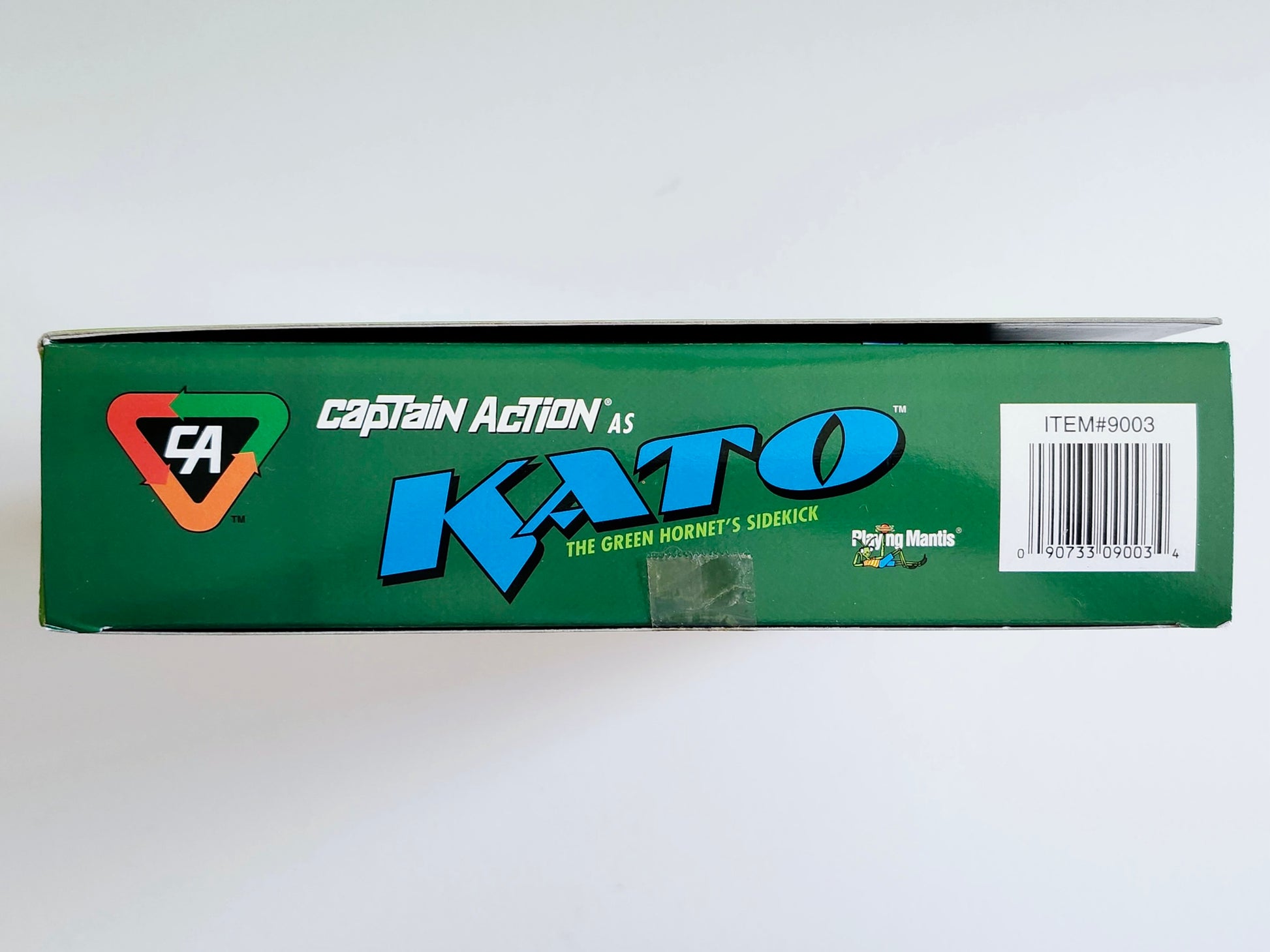 This is a 12-inch scale action figure of Captain Action as Kato, the Green Hornet's sidekick from 1998. The box art of this set was drawn by legendary comic book artist Carmine Infantino. This limited edition, original reproduction of Captain Action comes dressed in an authentic replica of his 1960's Green Hornet television series Kato costume, complete with a mask, a cap, a chauffeur's uniform, brass knuckles, ninja-style throwing stars, nunchakus, and a micro-radar watch.