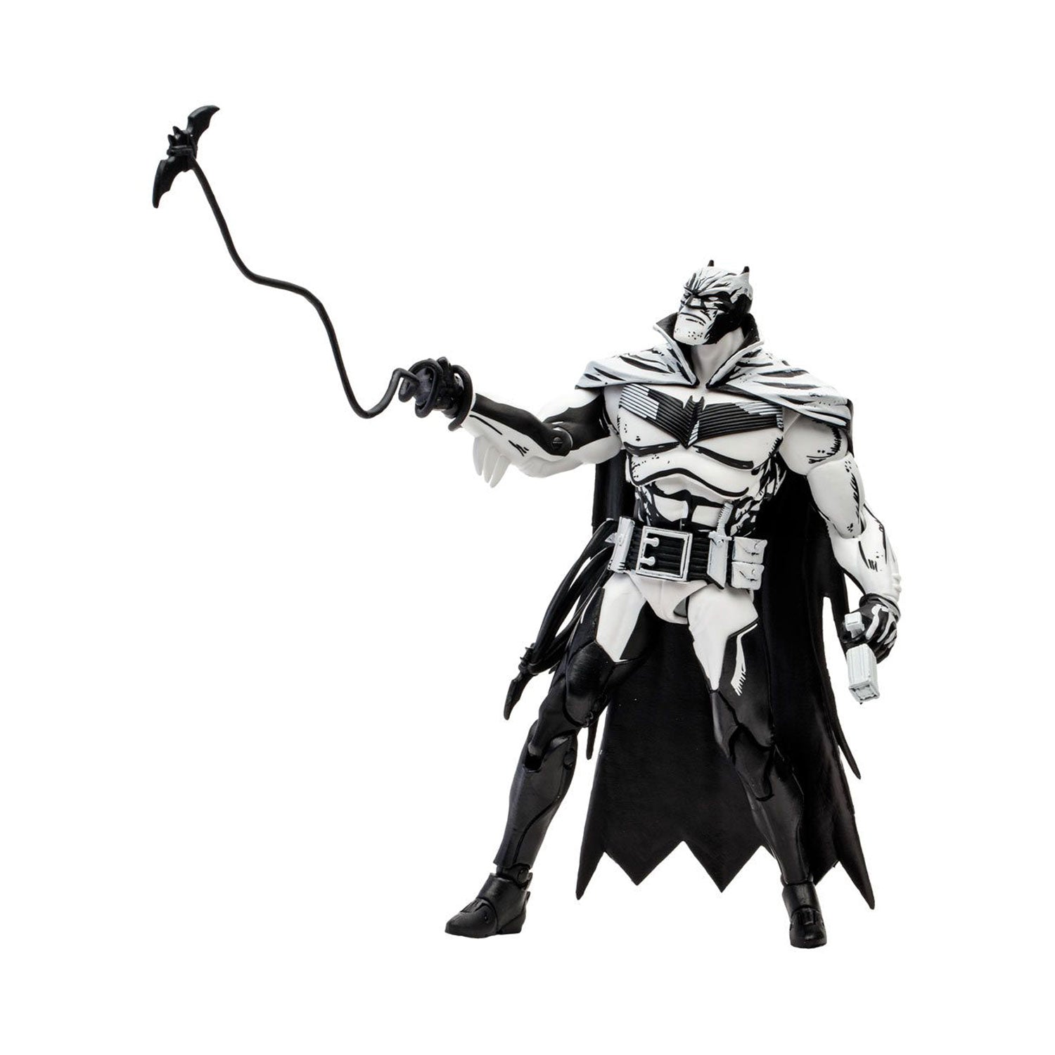This Entertainment Earth exclusive DC Multiverse action figure - Batman: White Knight - features monochromatic artist-sketch decoration. This Batman is seven inches tall and fully poseable. The figure's accessories include a grapnel launcher, a batarang with line, wrapped batarang with line, a display base, and an art-card stand. Also included is a collectible card with a numbered certificate of authenticity on the back. This set is limited to between 3,000 and 5,800 pieces.