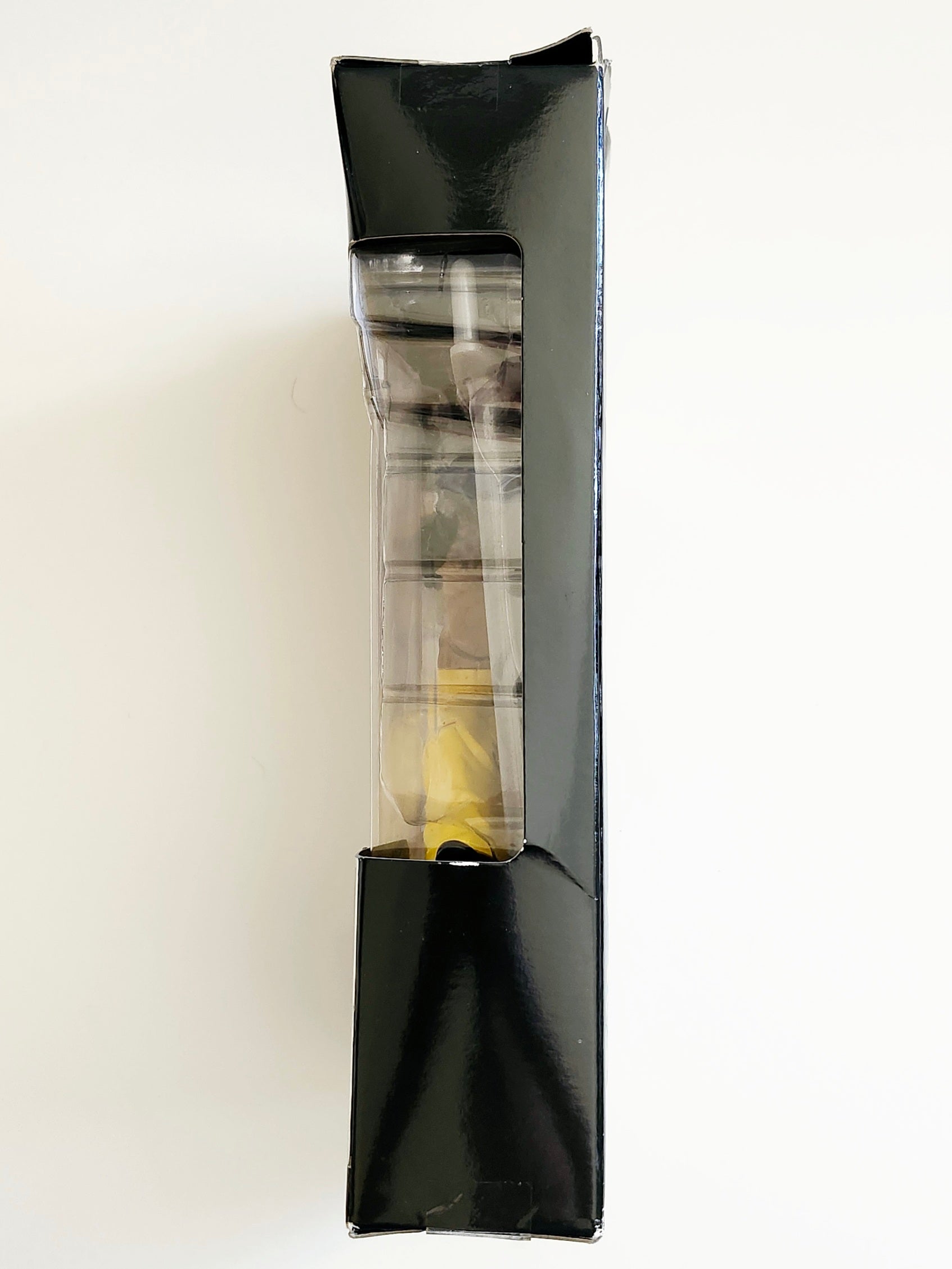 This figure is new in a good package that has a few creases near the top and a small tear on the side edge.