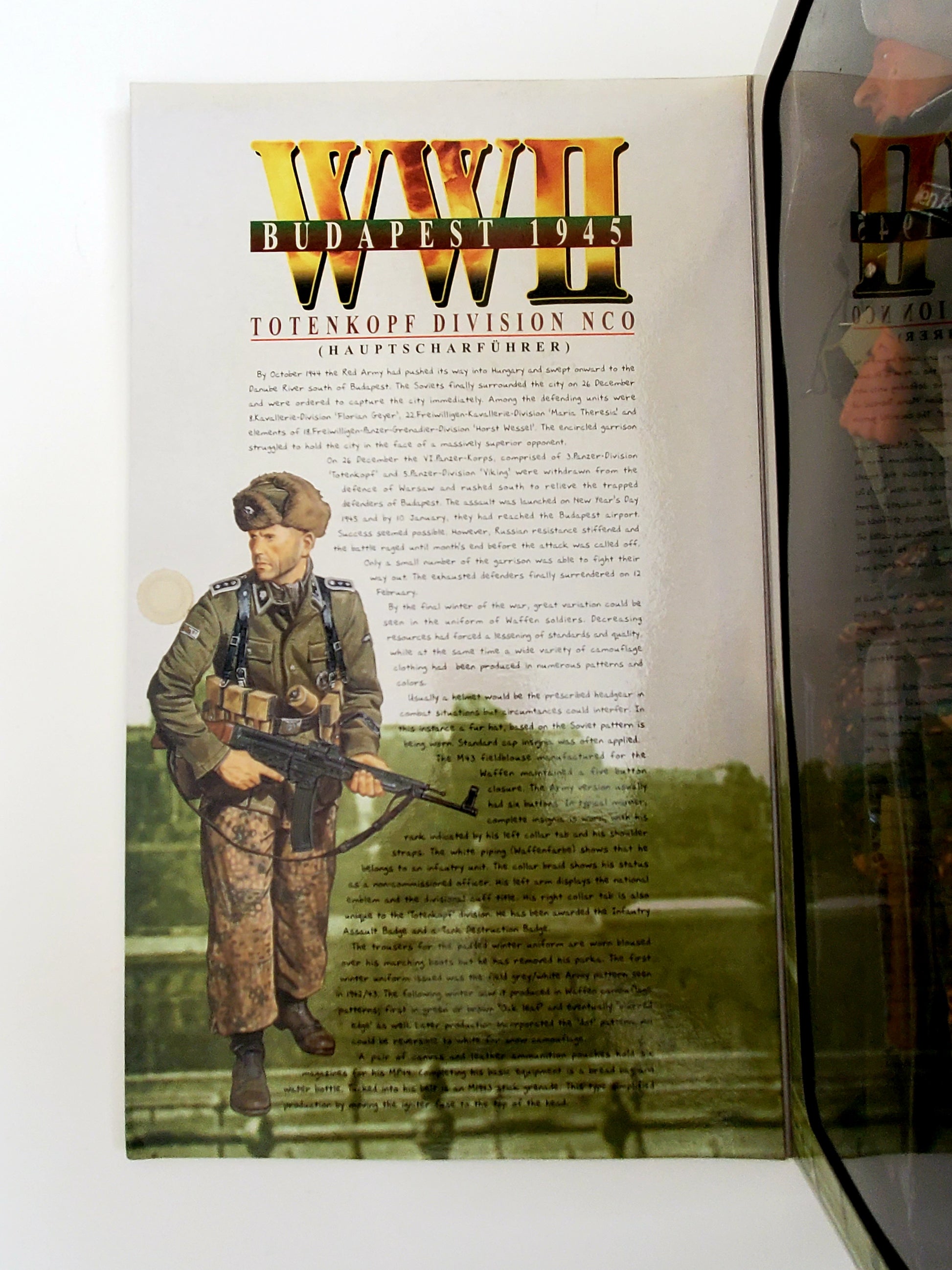 This WWII Budapest 1945 Totenkopf Division NCO (Hauptscharfuhrer) 12-inch "Hermann" action figure comes with an authentic uniform with detailed decorations - including winter combat trousers, a winter cap, an MP44 assault rifle, a stick grenade M1943, and other accessories.