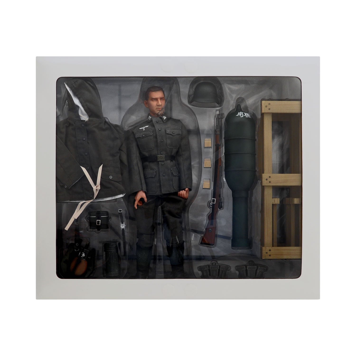 This WWII Eastern Front 1943 Schweres Wurfgerat 41 and Rocket Crew (Obergefreiter) 12-inch “Lang” action figure comes with an authentic uniform with detailed decorations, a winter combat parka, winter combat trousers, weapons, a Wurfgerat 41 rocket launcher, a wooden shipping/launcher crate, and a 28 cm Wurfkorper Spreng rocket.