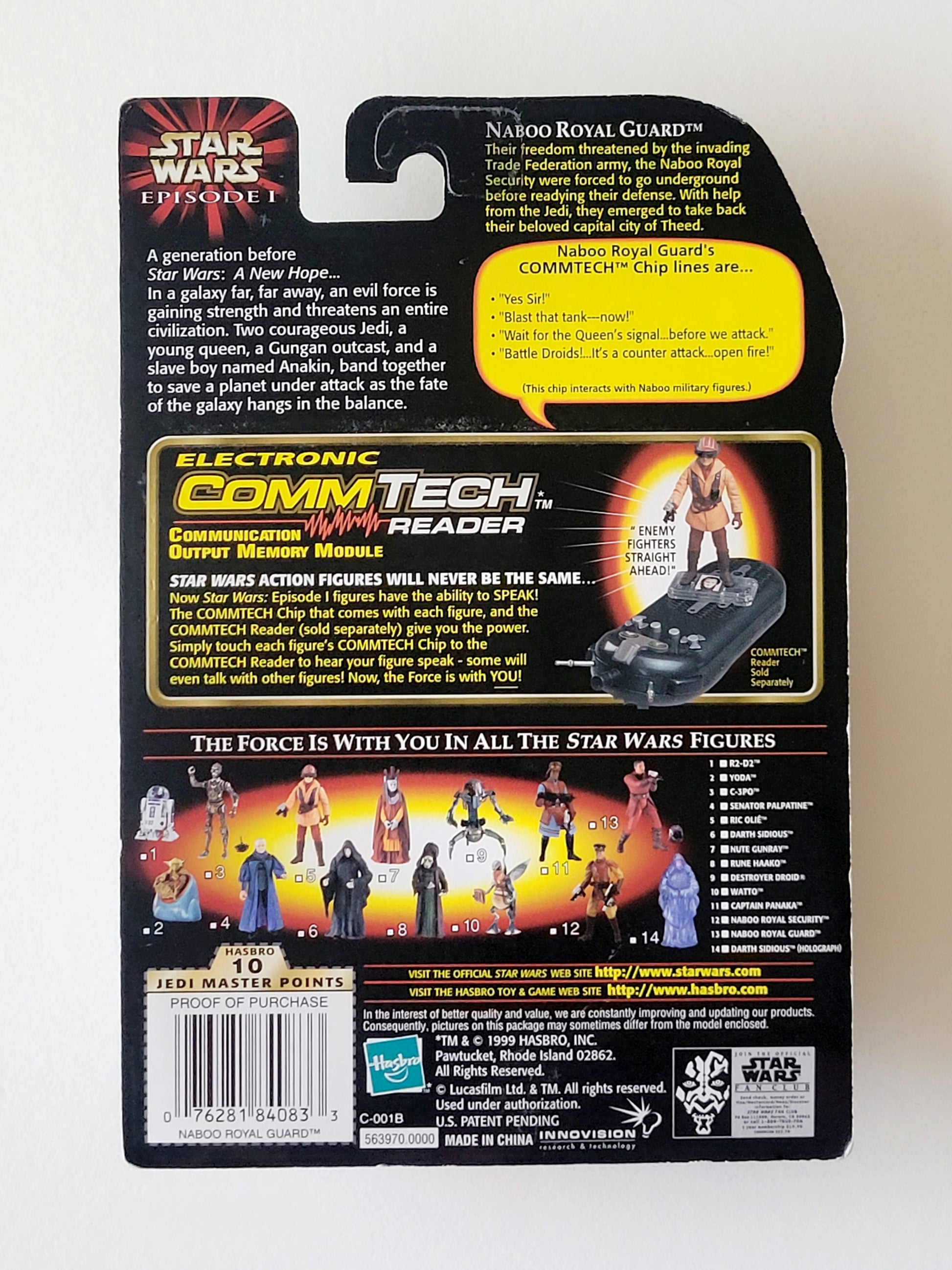 This figure of Naboo Royal Guard from Star Wars: Episode 1 comes with a blaster pistol, a helmet, and a CommTech chip.
