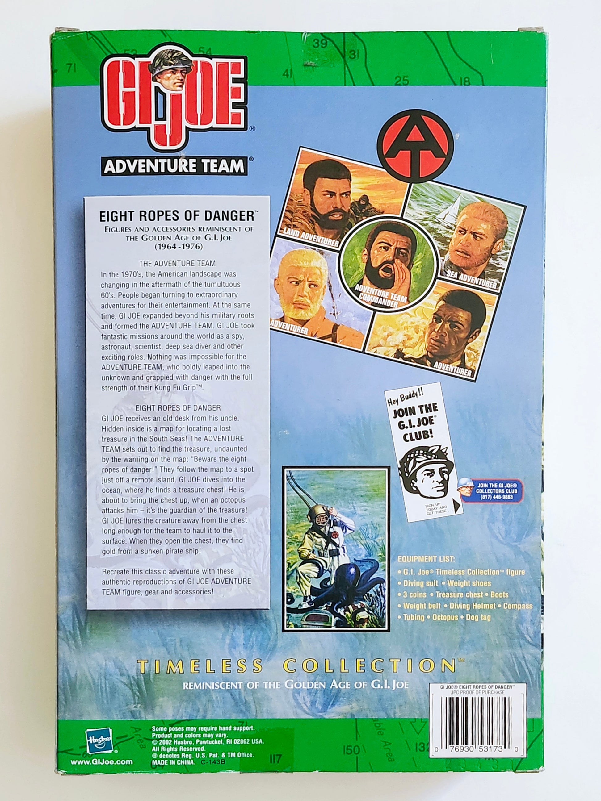 The Adventure Team Eight Ropes of Danger set includes a 12-inch G.I. Joe figure, a diving suit, weight shoes, three coins, a treasure chest, boots, a weight belt, a diving helmet, a compass, tubing, an octopus, and dog tags with a chain.