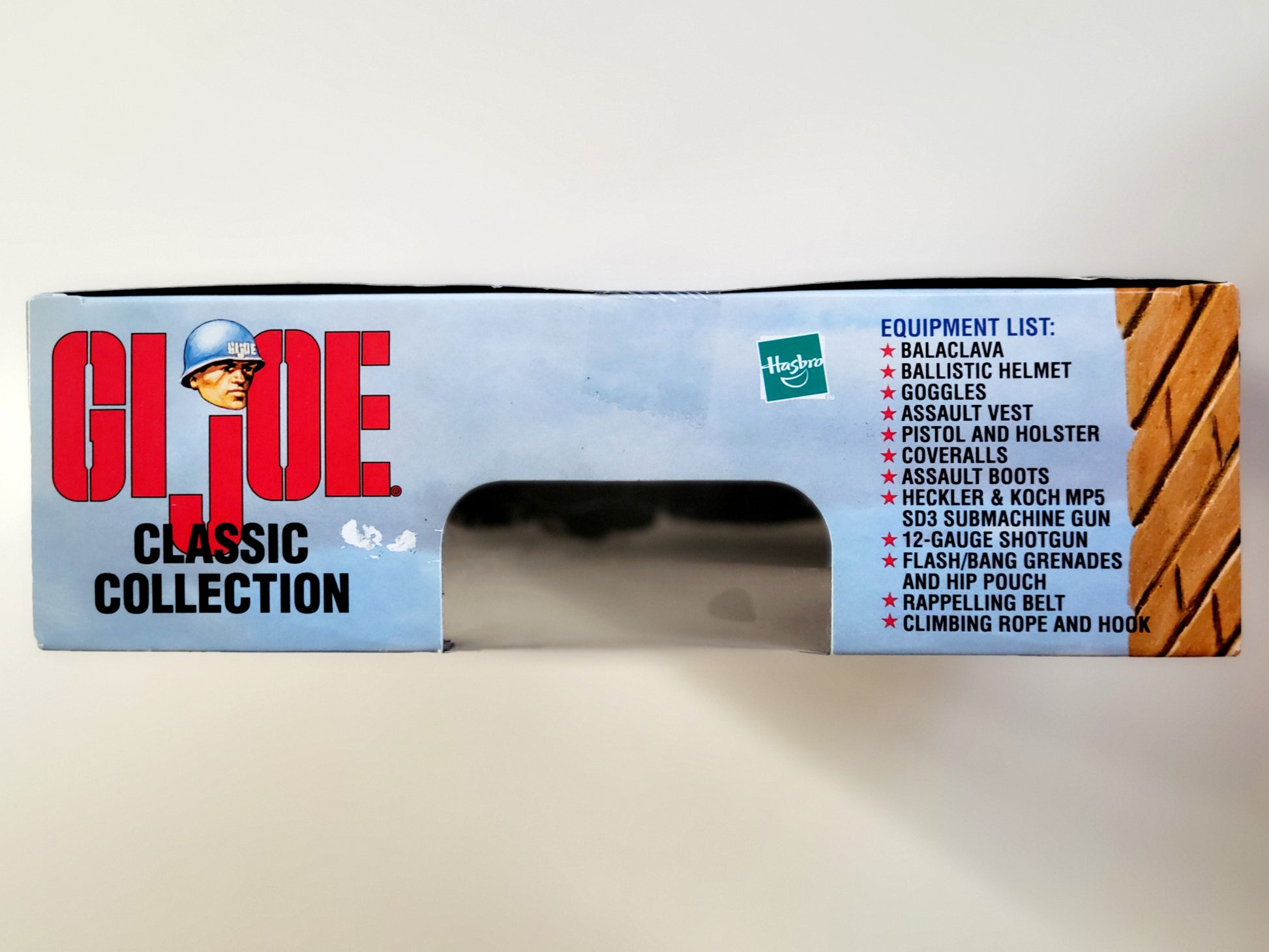 The G.I. Joe Classic Collection Delta Soldier set includes a 12-inch G.I. Joe action figure, a balaclava, a ballistic helmet, goggles, an assault vest, a pistol with a holster, coveralls, assault boots, a Heckler & Koch MP5 SD3 submachine gun, a 12-gauge shotgun, flash/bang grenades and a hip pouch, a rappelling belt, a climbing rope, and a hook.