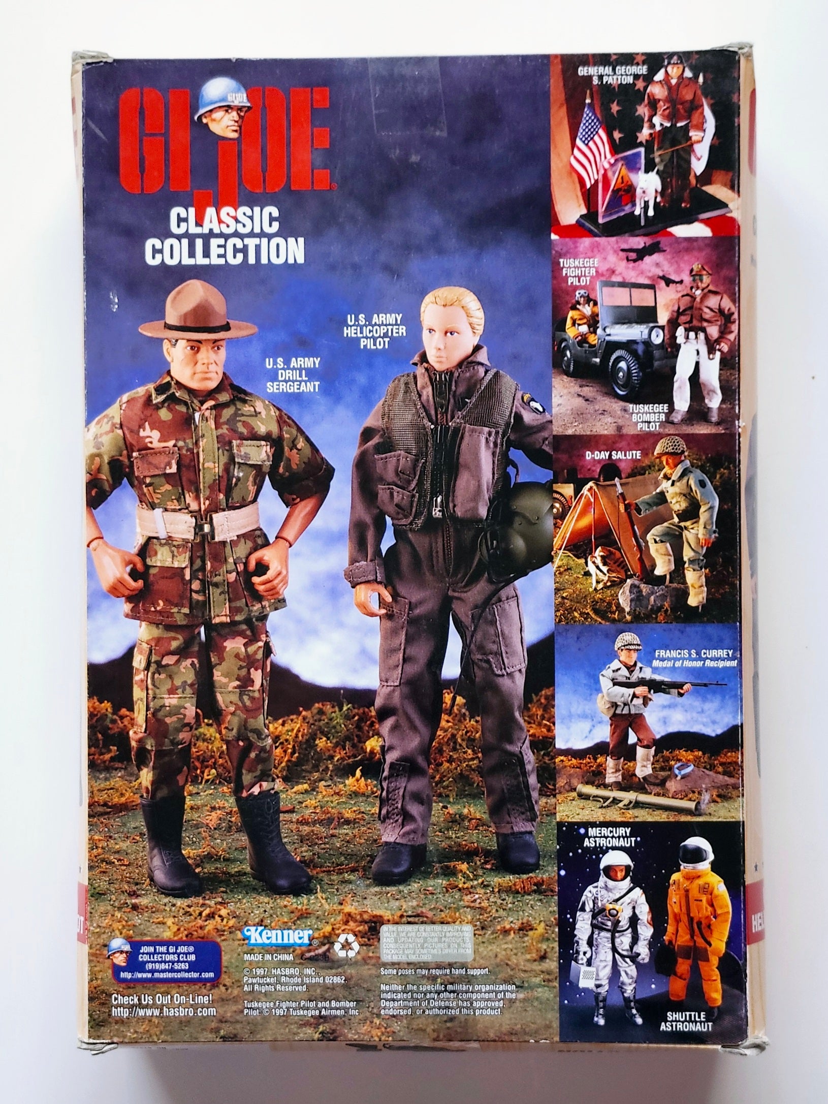 This G.I. Jane U.S. Army Helicopter Pilot set includes a 12-inch G.I. Jane figure, an AN/PCR-90 radio, a survival vest, a pistol, a jump suit, a flight helmet, boots, and dog tags.