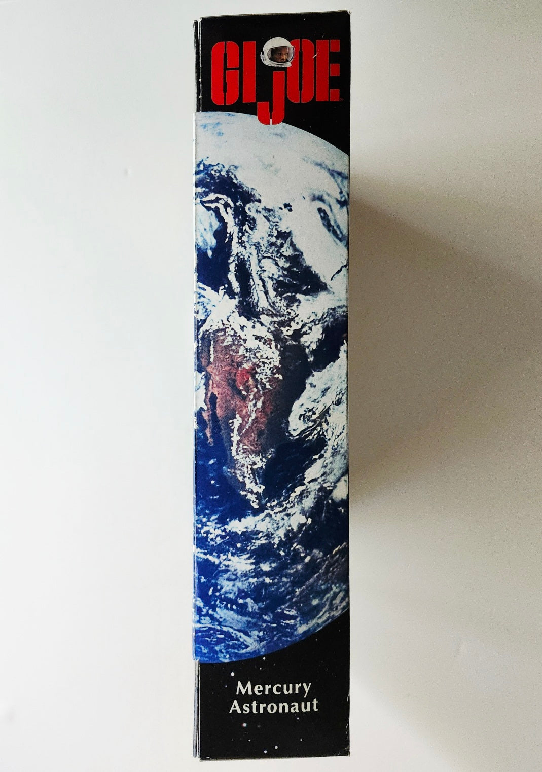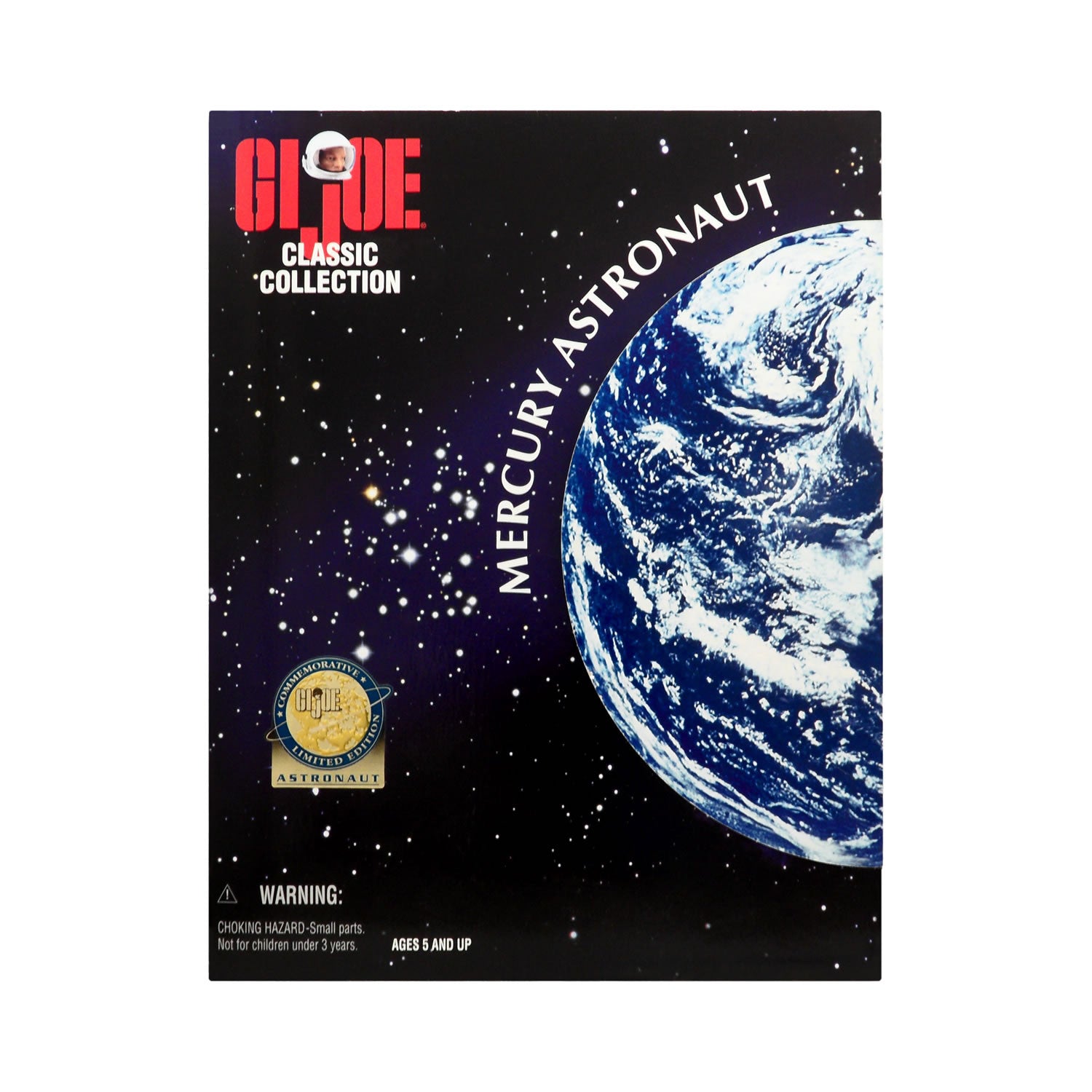 This commemorative limited edition Mercury Astronaut G.I. Joe set includes a 12-inch figure, a helmet with a com-link and a visor, a space suit with a NASA patch and air hose connector, gloves, an air hose, a ventilator, boots, and dog tags.
