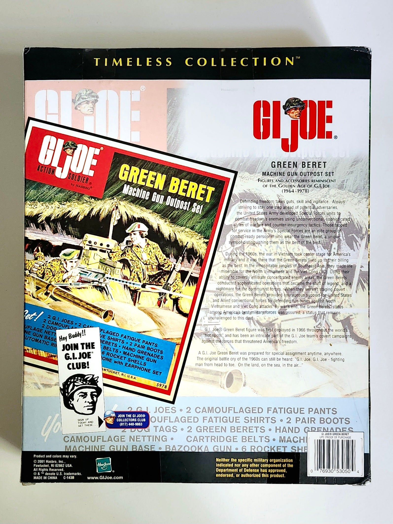 This Timeless Collection Green Beret Machine Gun Outpost Set from 2001 includes a 12-inch G.I. Joe, a beret, a shirt, pants, boots, a belt, tent netting, six foliage pieces, two tent guide lines, two tent guide stakes, twelve tent poles, twelve insert plugs, a machine gun, a tripod, a bazooka, two bazooka shells, an ammo box, three grenades, a field radio, an M-16 rifle with a strap, an ammo pouch, and dog tags with a chain.