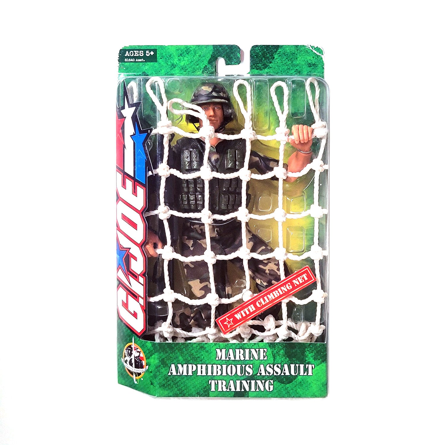 The Marine Amphibious Assault Training set includes a 12-inch G.I. Joe action figure, pants, boots, a vest, a helmet, a gun, and a climbing net.
