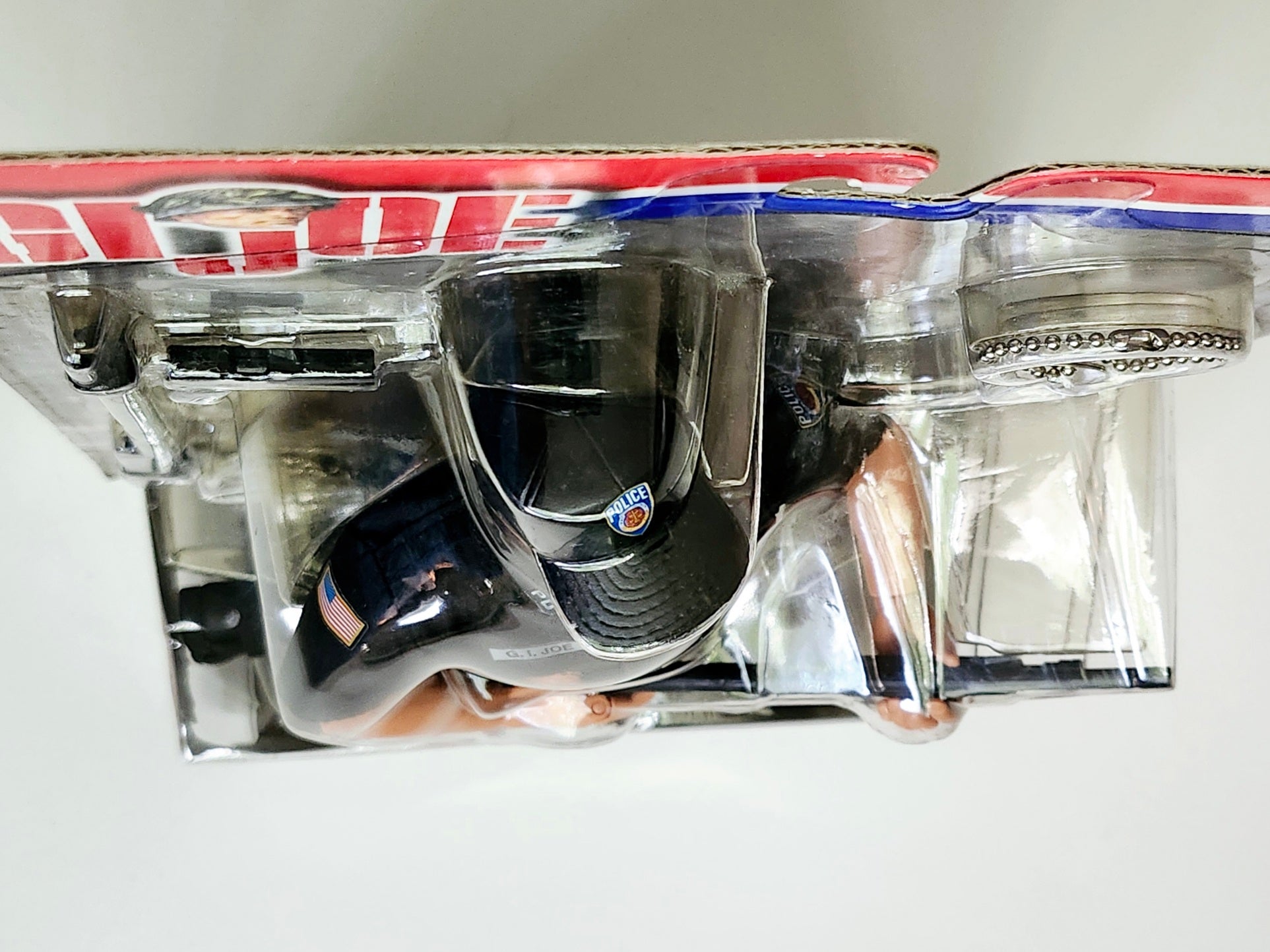 This G.I. Joe Police Officer figure comes with a shirt, pants, boots, a cap, a shotgun, a flashlight, a belt holster with pouches, a pistol with a clip, handcuffs, a radio and microphone, a cord with a clip, and dog tags.