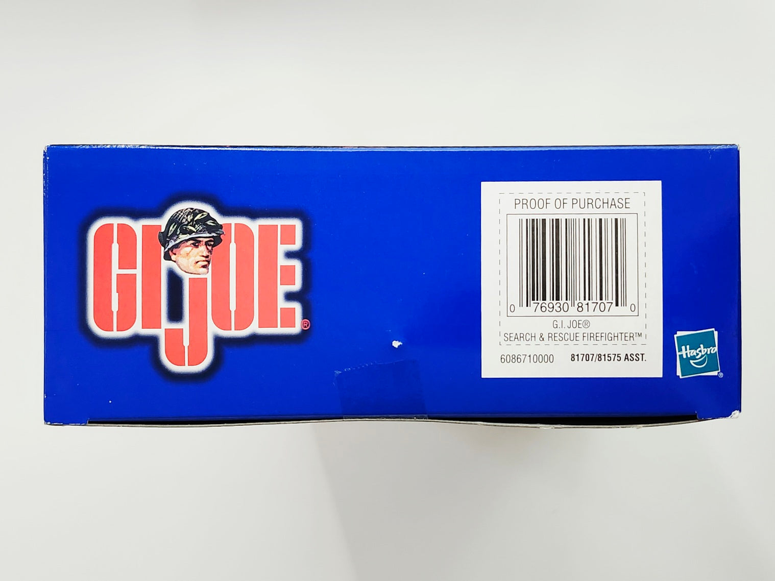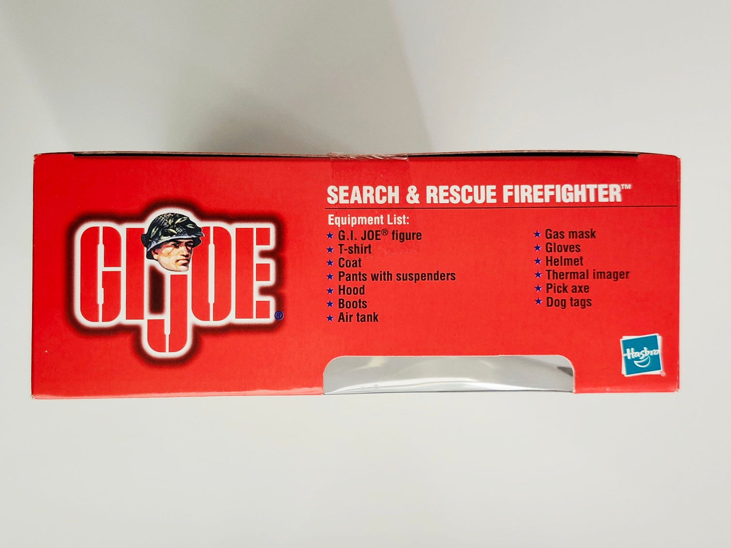 This 2001 Search & Rescue Firefighter set includes a 12-inch G.I. Joe action figure, a t-shirt, a coat, pants with suspenders, a hood, boots, an air tank, a gas mask, gloves, a helmet, a thermal imager, a pick axe, and dog tags.