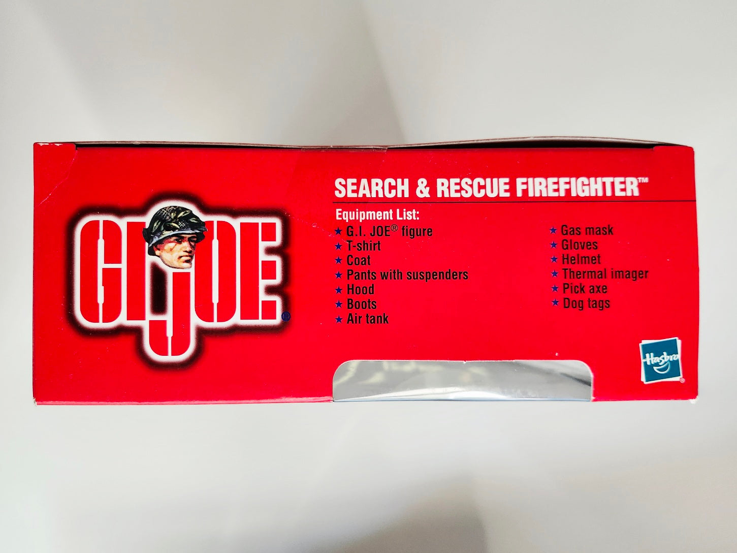 This 2001 Search & Rescue Firefighter set includes a 12-inch G.I. Joe action figure, a t-shirt, a coat, pants with suspenders, a hood, boots, an air tank, a gas mask, gloves, a helmet, a thermal imager, a pick axe, and dog tags.
