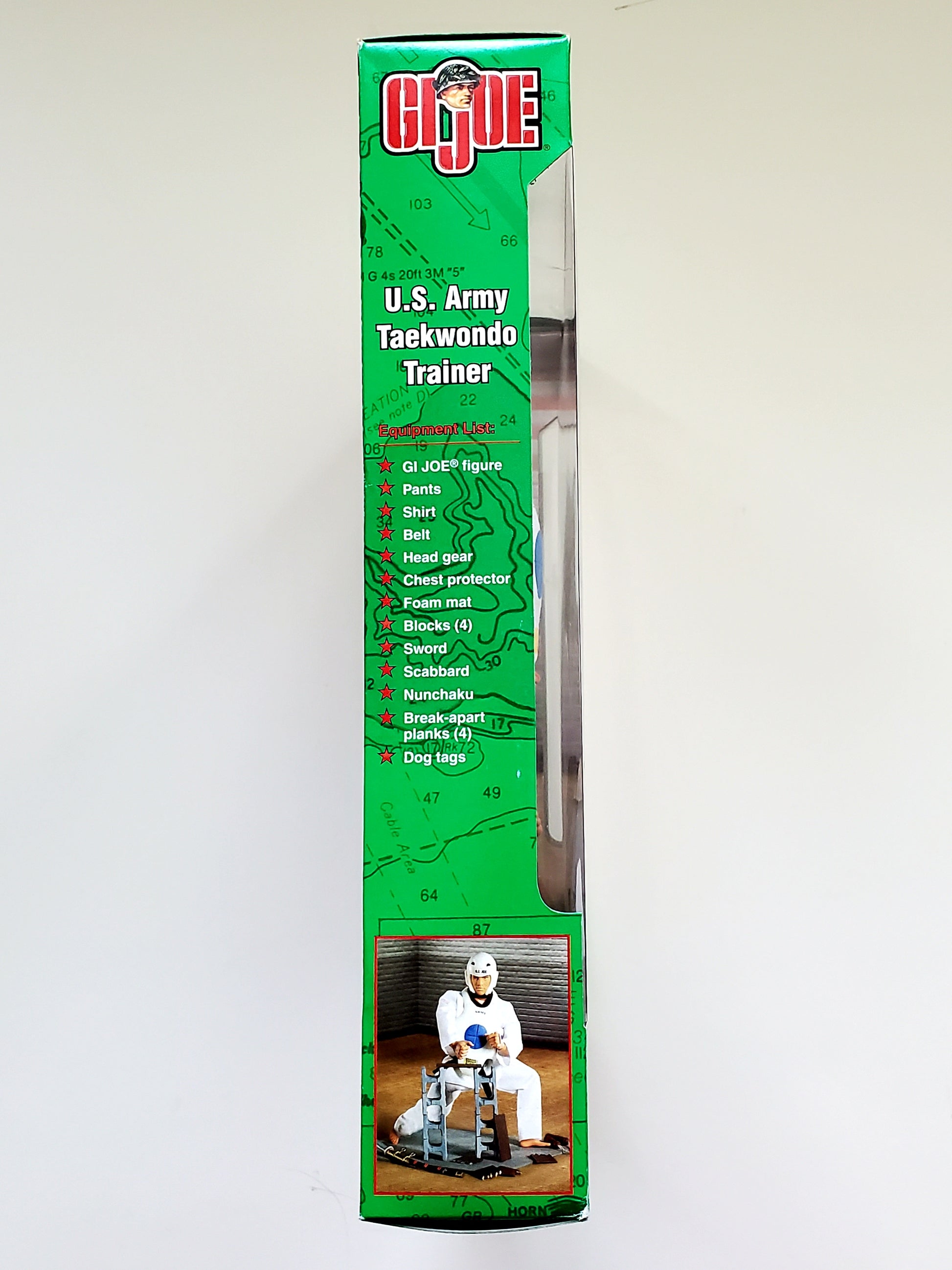 This rare U.S. Army Taekwondo Trainer G.I. Joe set includes a 12-inch action figure with a taekwondo outfit (including pants, a shirt, and a black belt), head gear, a chest protector, a foam mat, four "cinder" blocks for taekwondo practice, a sword, a scabbard, nunchakus, four break-apart planks, and dog tags.