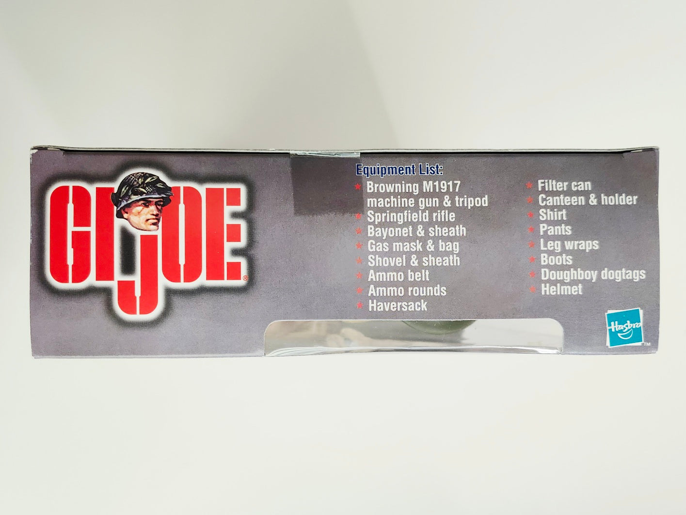 The World War I Doughboy 12-inch G.I. Joe action figure comes with a browning M1917 machine gun and a tripod, a Springfield rifle, a bayonet and a sheath, a gas mask with a bag, a shovel and a sheath, an ammo belt, ammo rounds, a haversack, a filter can, a canteen with a holder, a shirt, pants, leg wraps, boots, dog tags, and a helmet.