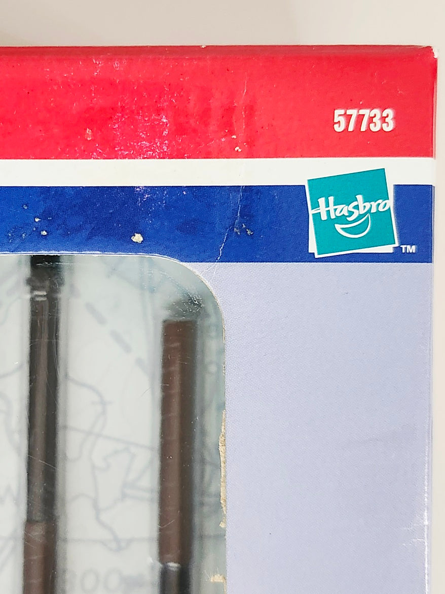 This G.I. Joe set from 2000 comes with a 12-inch action figure, boots, a shirt, pants, a belt, a helmet with netting, a .45 caliber pistol with a holster, a belt bag, a ramrod, a grenade bandolier, binoculars with a case, a generator box with an antenna, and a dog tag with a chain.