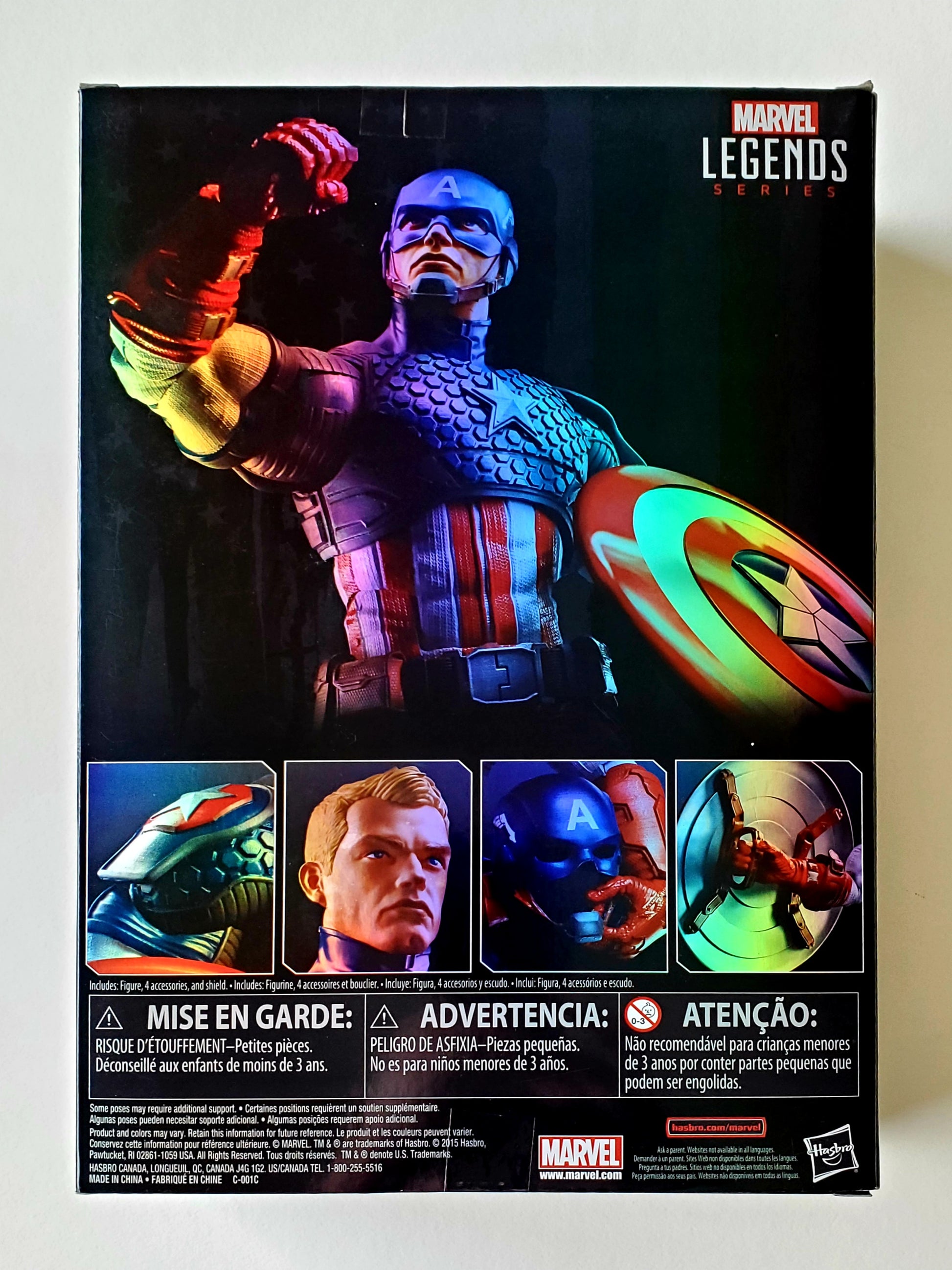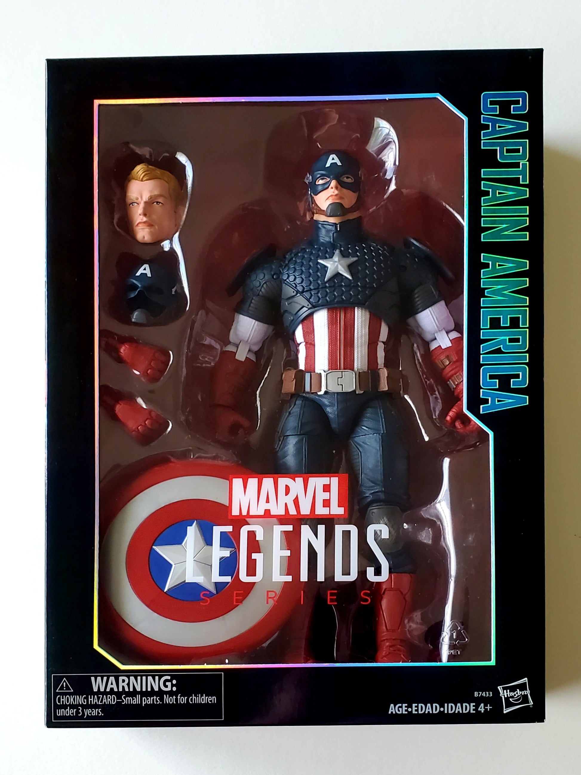 This Captain America figure is about twelve inches tall and super poseable. The figure comes with a shield, an unmasked head, a helmet, and interchangeable hands