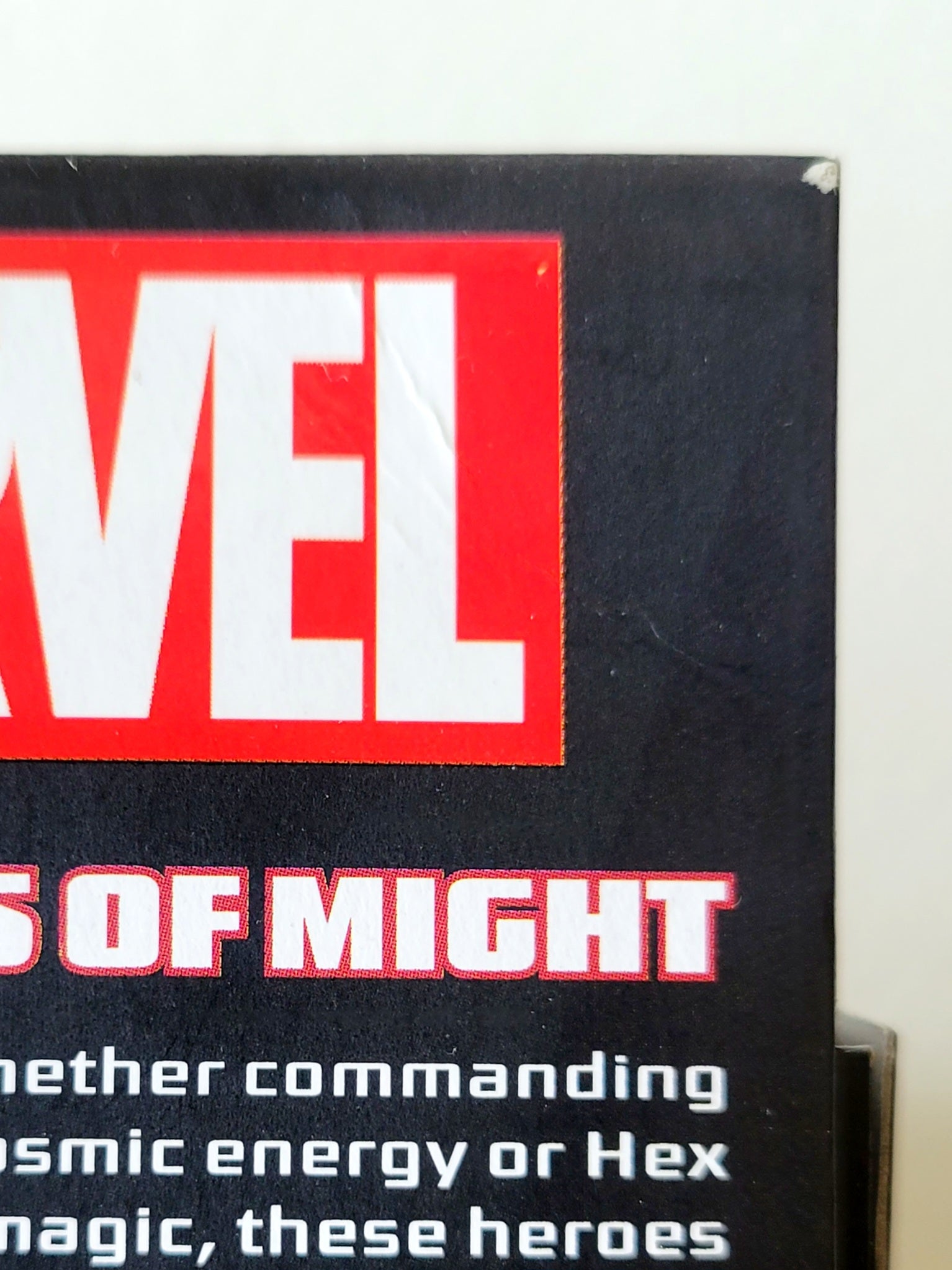 This Marvel Legends figure features a highly detailed, super-poseable Scarlet Witch figure with hex blast accessories. This figure was issued with Odin's head, a cape, and a staff that can be used to build the Allfather figure.
