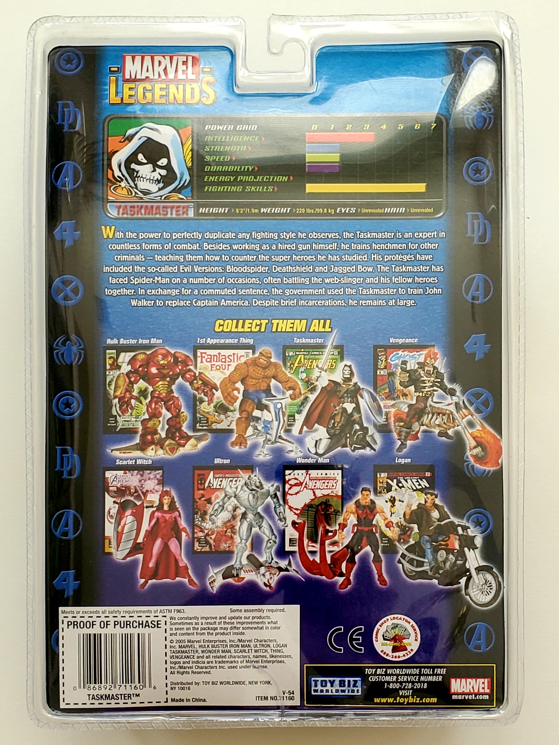 This Marvel Legends action figure features the villain Taskmaster with a sky cycle vehicle. The figure has thirty-four points of articulation, a cloak, a shield, a sword and other weapons, and a bonus 32-page comic book. This set also includes a Marvel vs. System trading card.