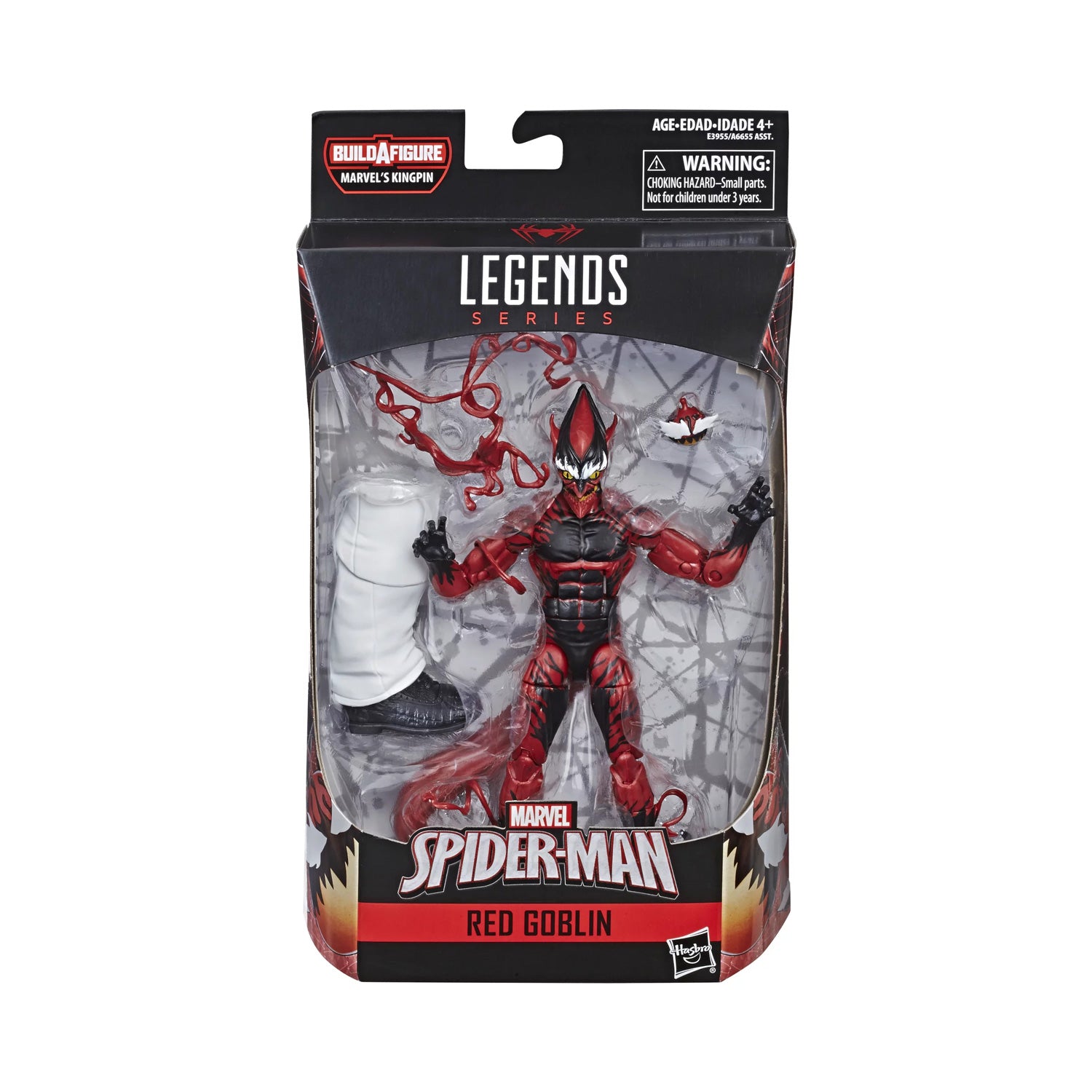 This Marvel Legends Red Goblin action figure is highly-detailed and super-poseable. This set includes a "symbiote" pumpkin bomb and a right leg that can be used for the Kingpin build-a-figure.