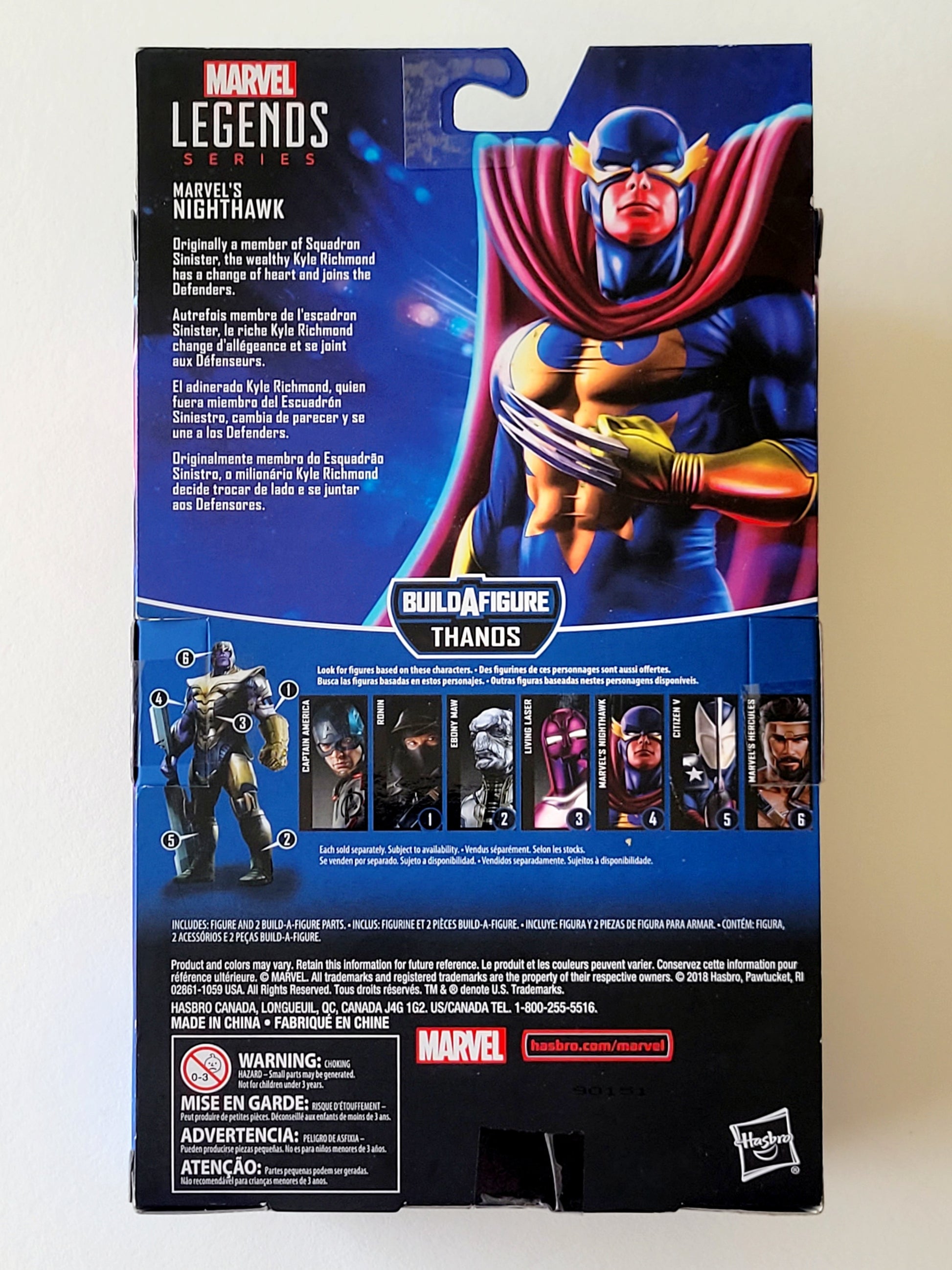 This Marvel Legends figure features a highly detailed, super-poseable Nighthawk with a cape. This figure was issued with a right arm and a sword for the armored Thanos build-a-figure.