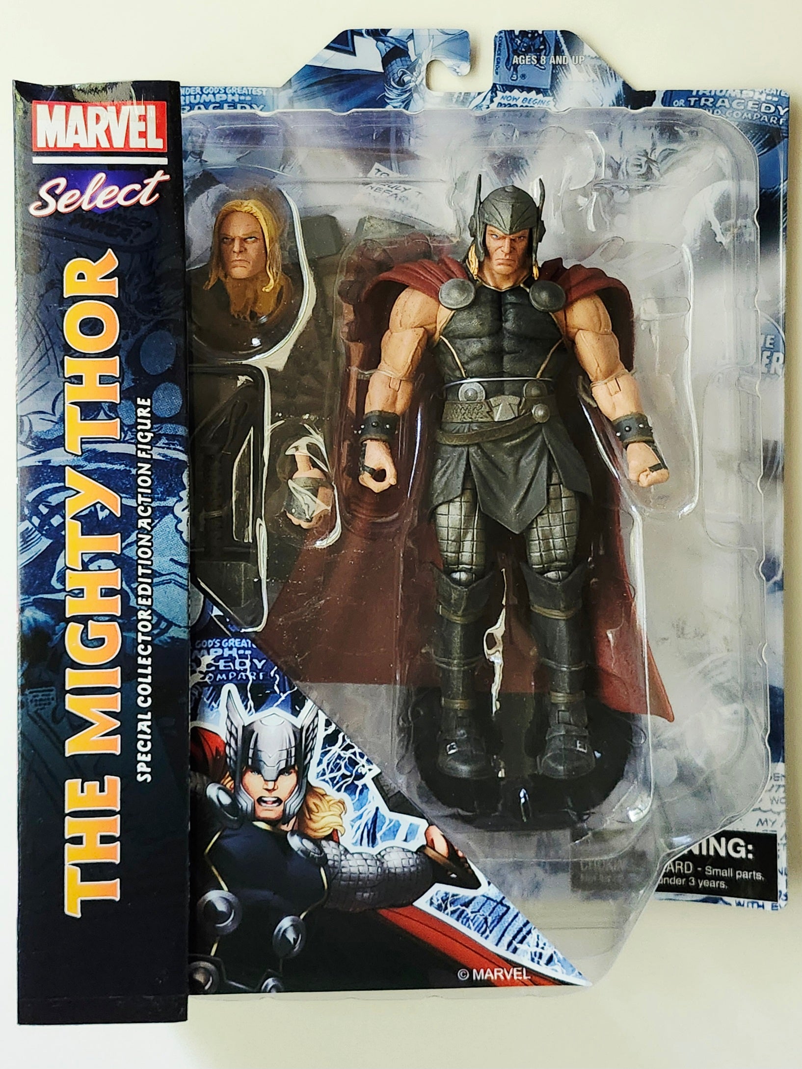 This highly-detailed seven inch scale figure of Thor features multiple interchangeable parts such as Mjolnir with a spinning hammer effect, and an alternate unhelmeted head. Measuring approximately eight inches tall, this fully poseable figure has 16 points of articulation.