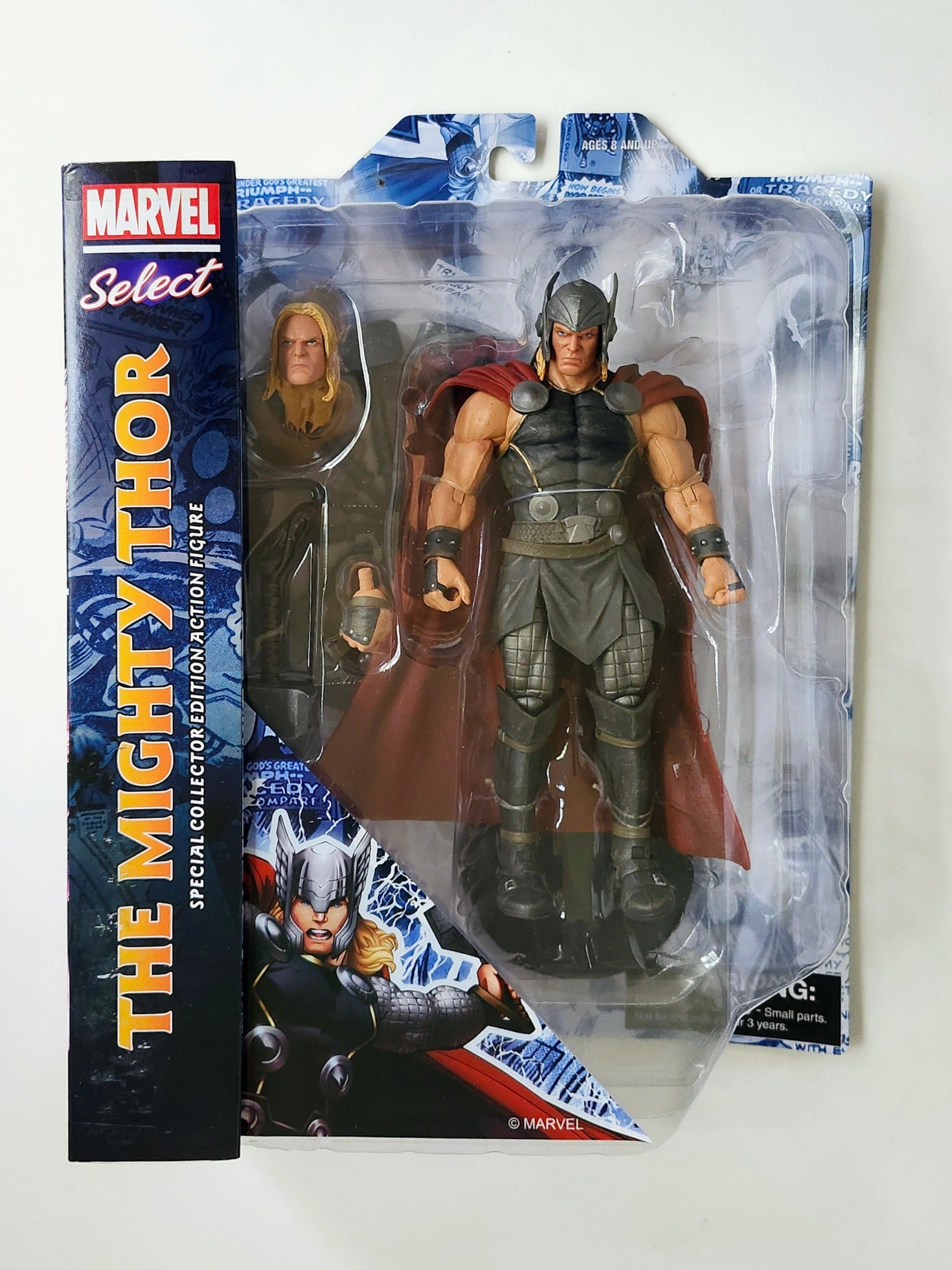 This highly-detailed seven inch scale figure of Thor features multiple interchangeable parts such as Mjolnir with a spinning hammer effect, and an alternate unhelmeted head. Measuring approximately eight inches tall, this fully poseable figure has 16 points of articulation.