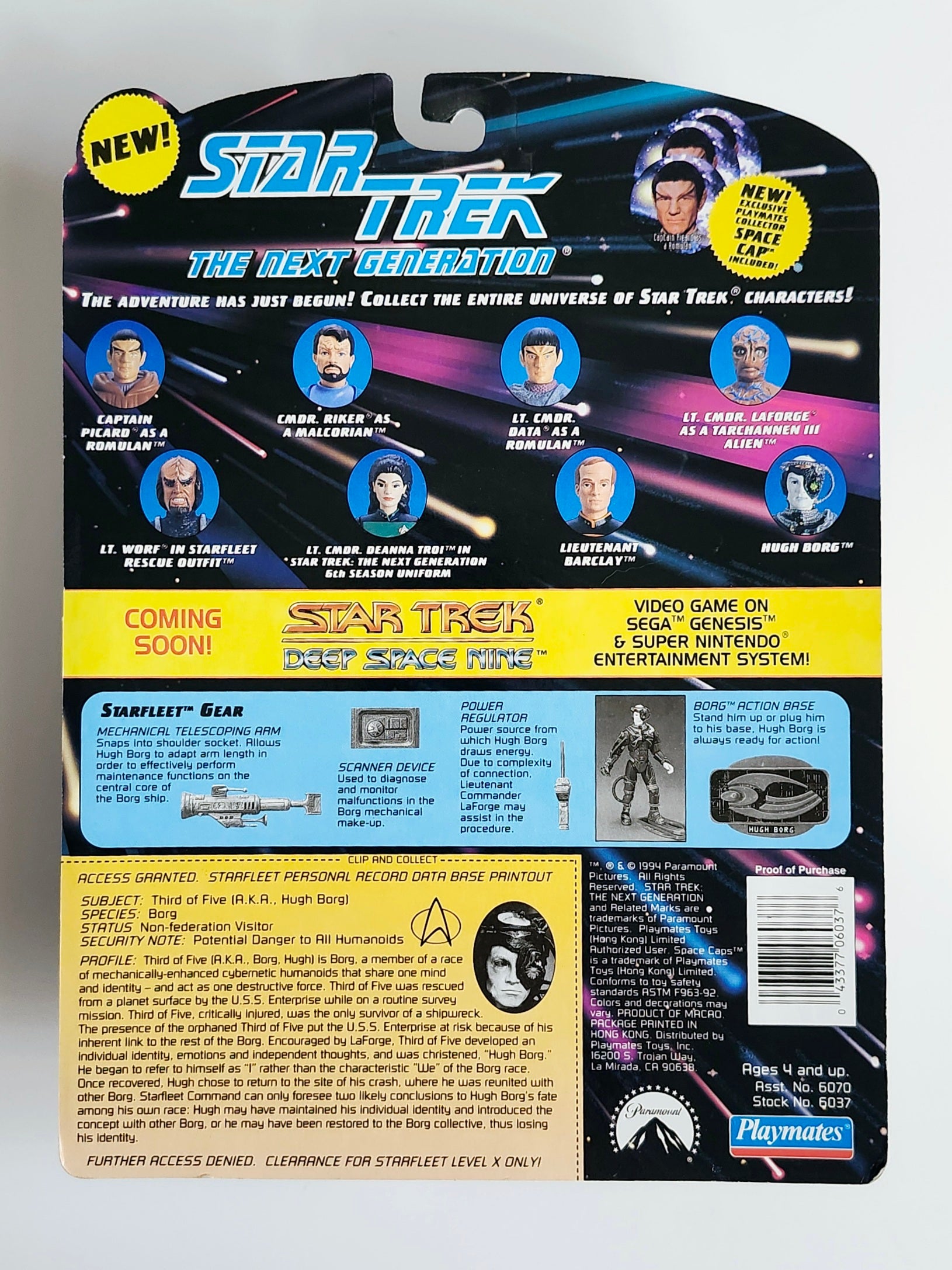 This Star Trek: The Next Generation Hugh Borg action figure comes with a mechanical telescoping arm, a scanner device, a power regulator, a Borg action base, and a Playmates Space Cap.
