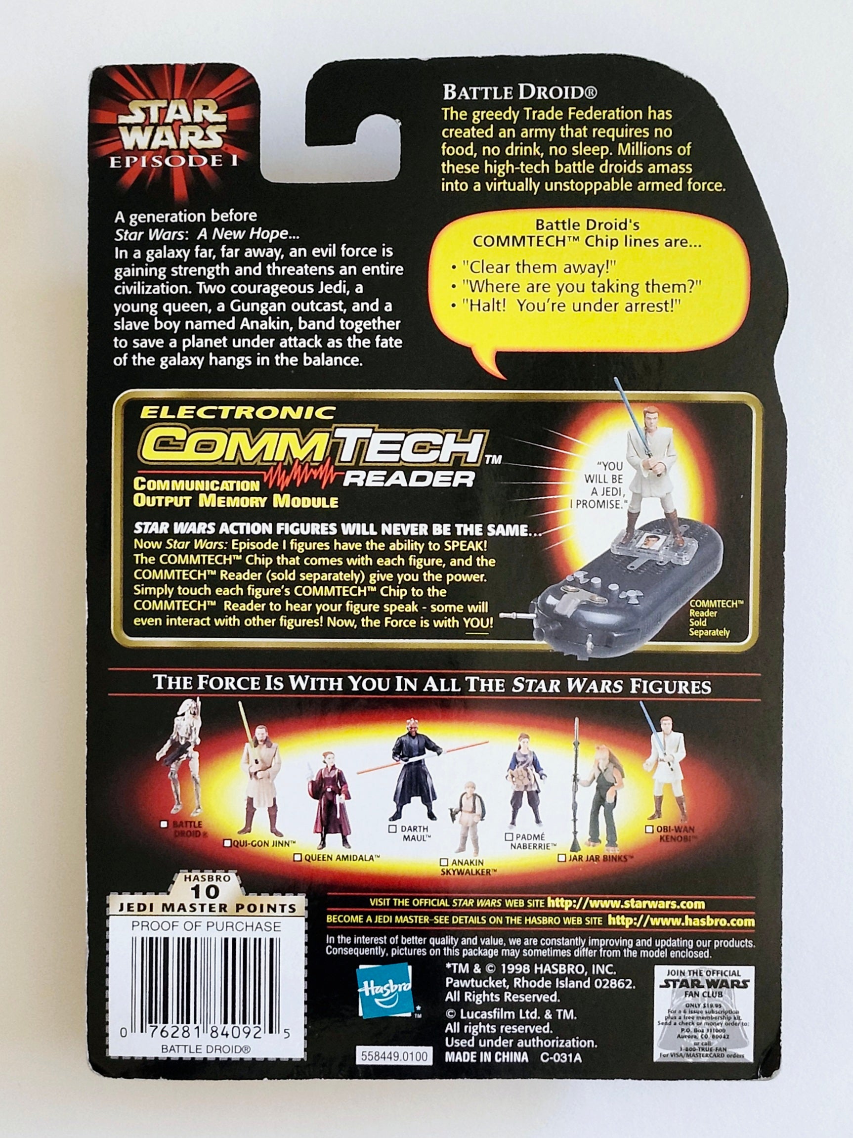 This Battle Droid figure from Star Wars: Episode 1 comes with a blaster rifle and a CommTech chip.