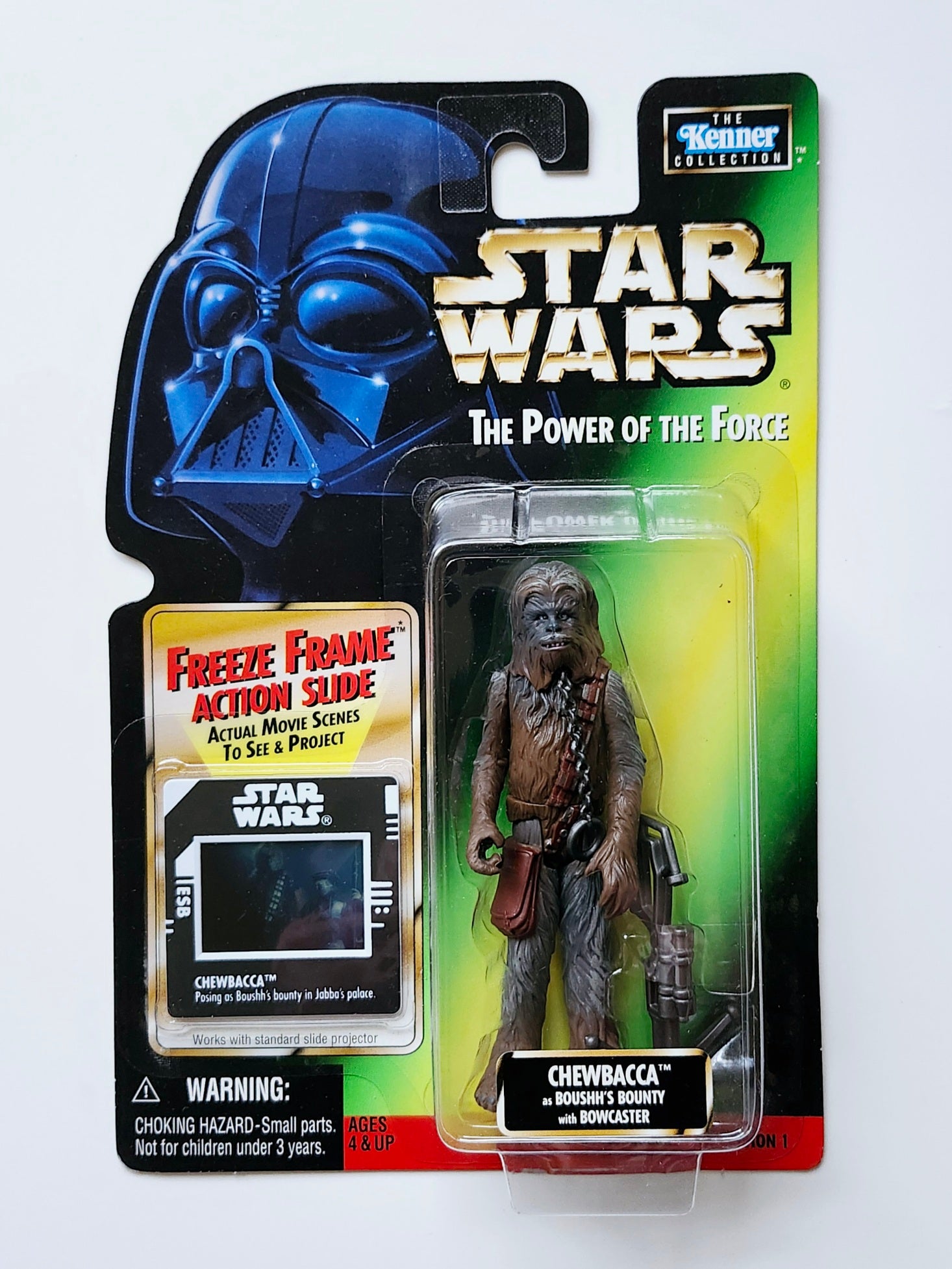 This Chewbacca figure from the Star Wars: Power of the Force series comes with a bowcaster and a "Freeze Frame" slide of Chewbacca posing as Boushh's bounty in Jabba's palace.