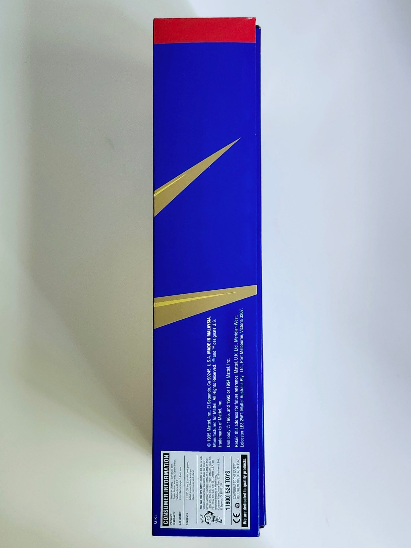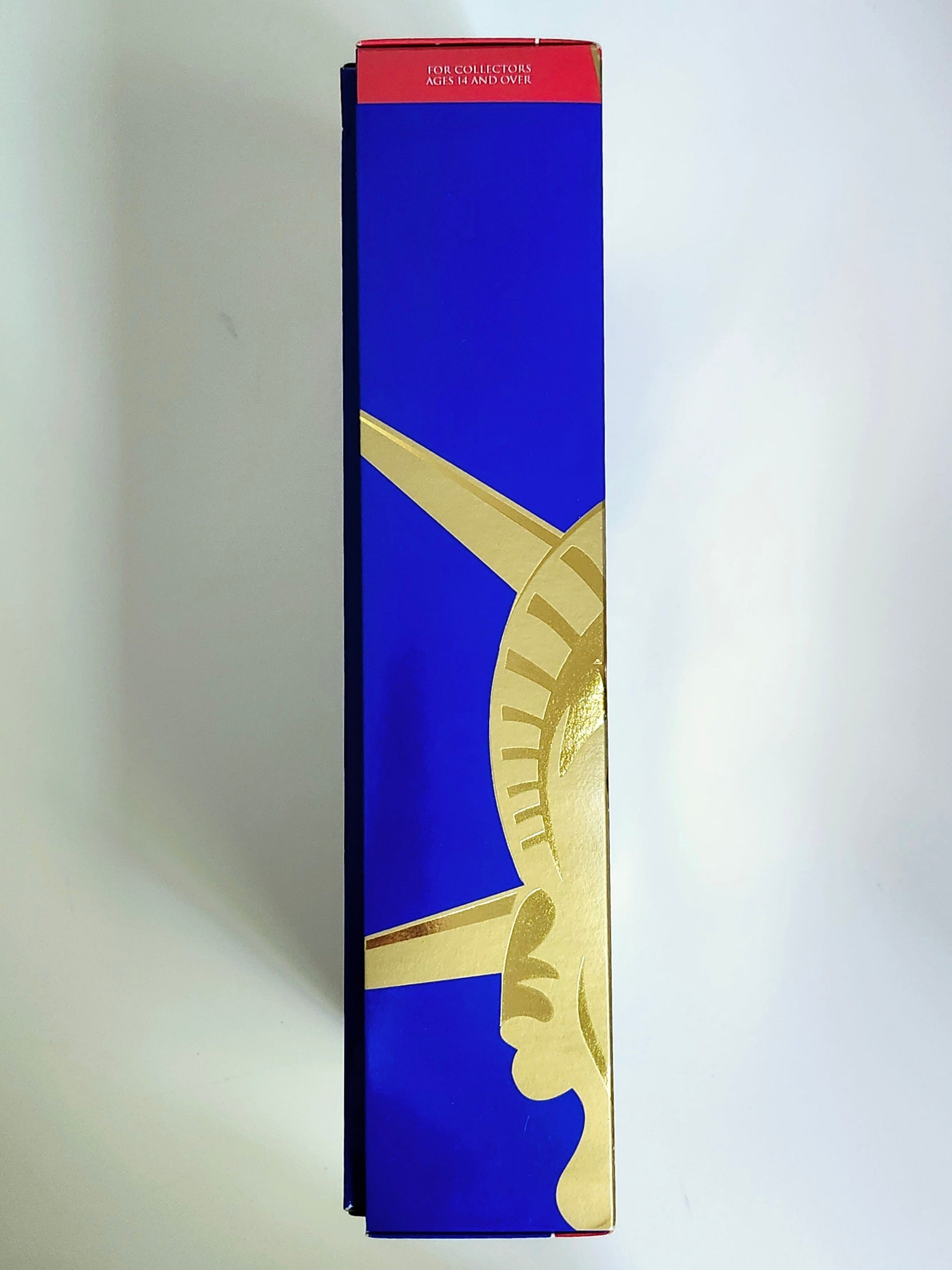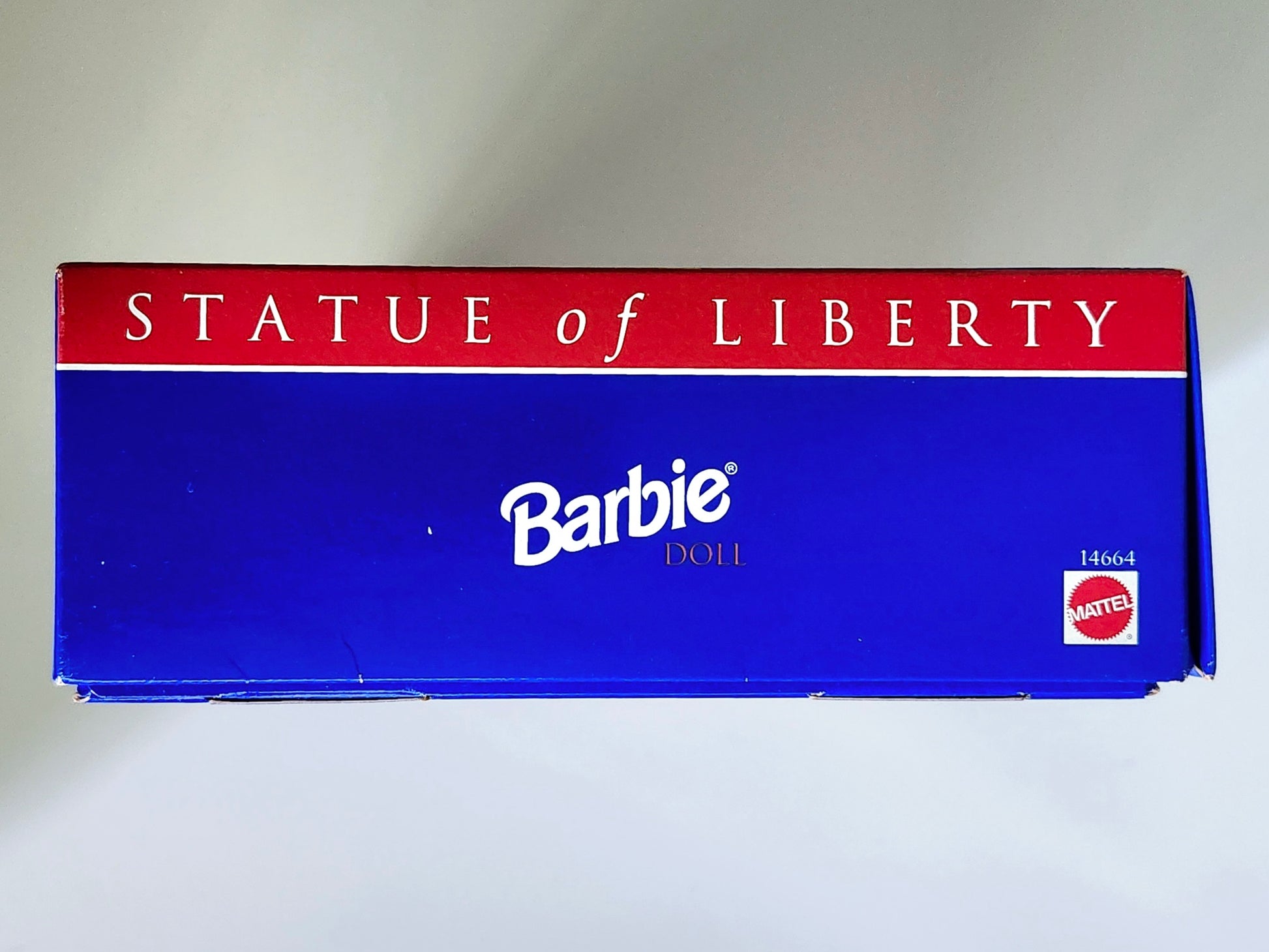 The Statue of Liberty Barbie from 1995 honors the 110th anniversary of the Statue of Liberty. This Barbie has long, blond hair, and is dressed in a red, white, and blue gown with a gold liberty crown. She is also holding a golden torch in the right hand and a golden tablet in the left. The figure also comes with star earrings, a hairbrush, shoes, and a doll stand.