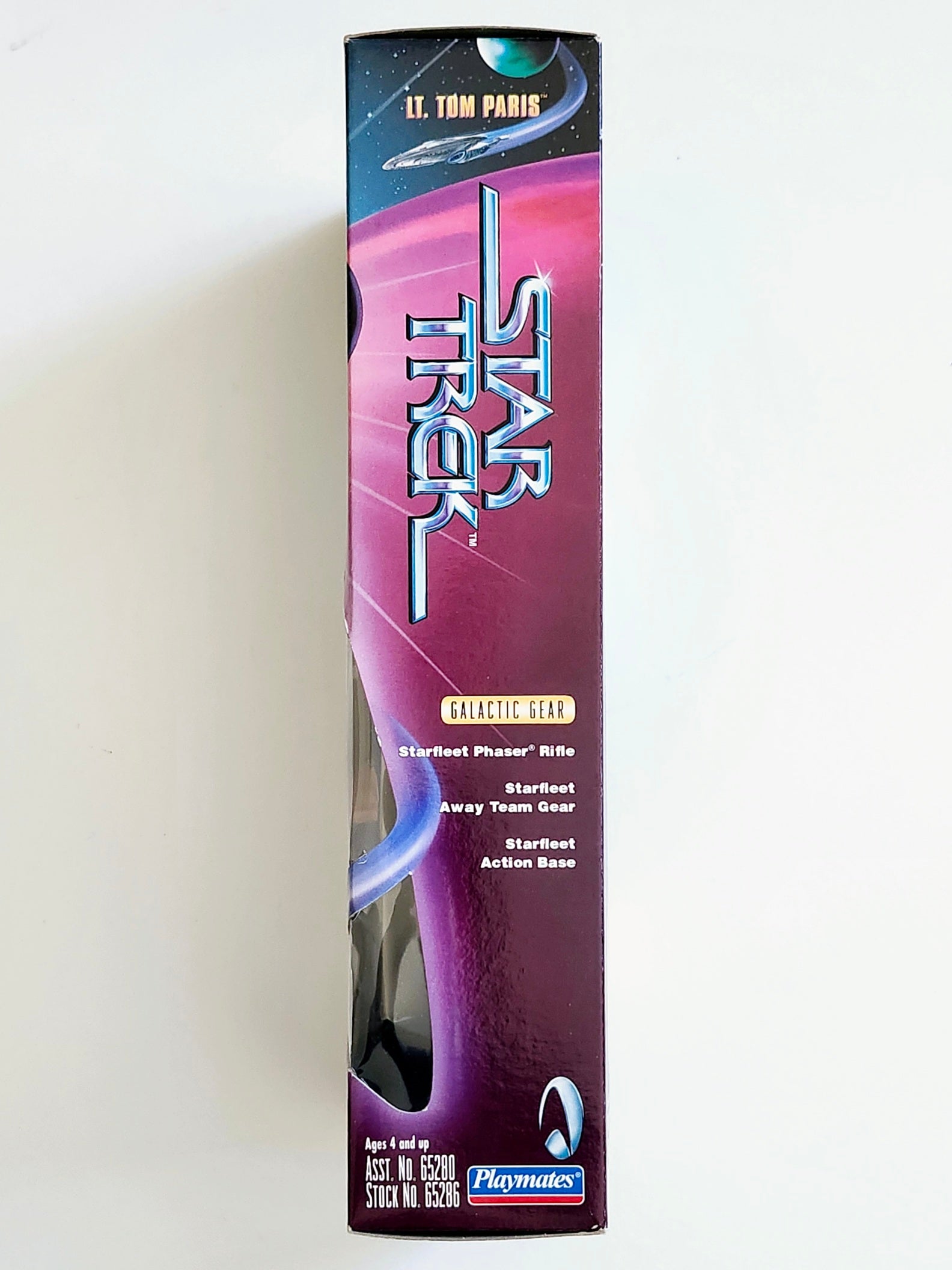 This 9-inch Lieutenant Tom Paris Star Trek action figure is from the serialized Warp Factor Series 2. The figure comes with a Starfleet phaser rifle, Starfleet away team gear, and a Starfleet action base.