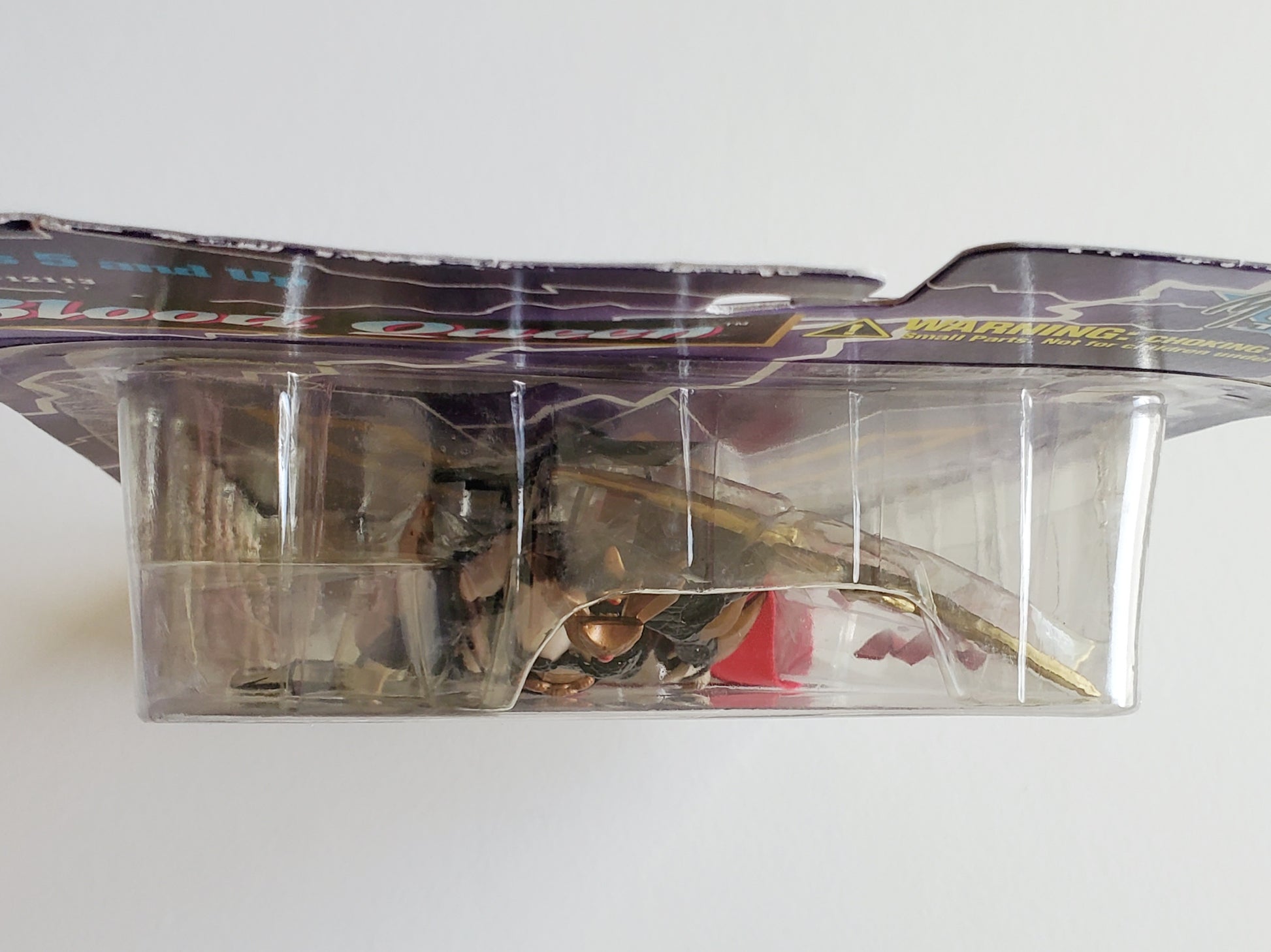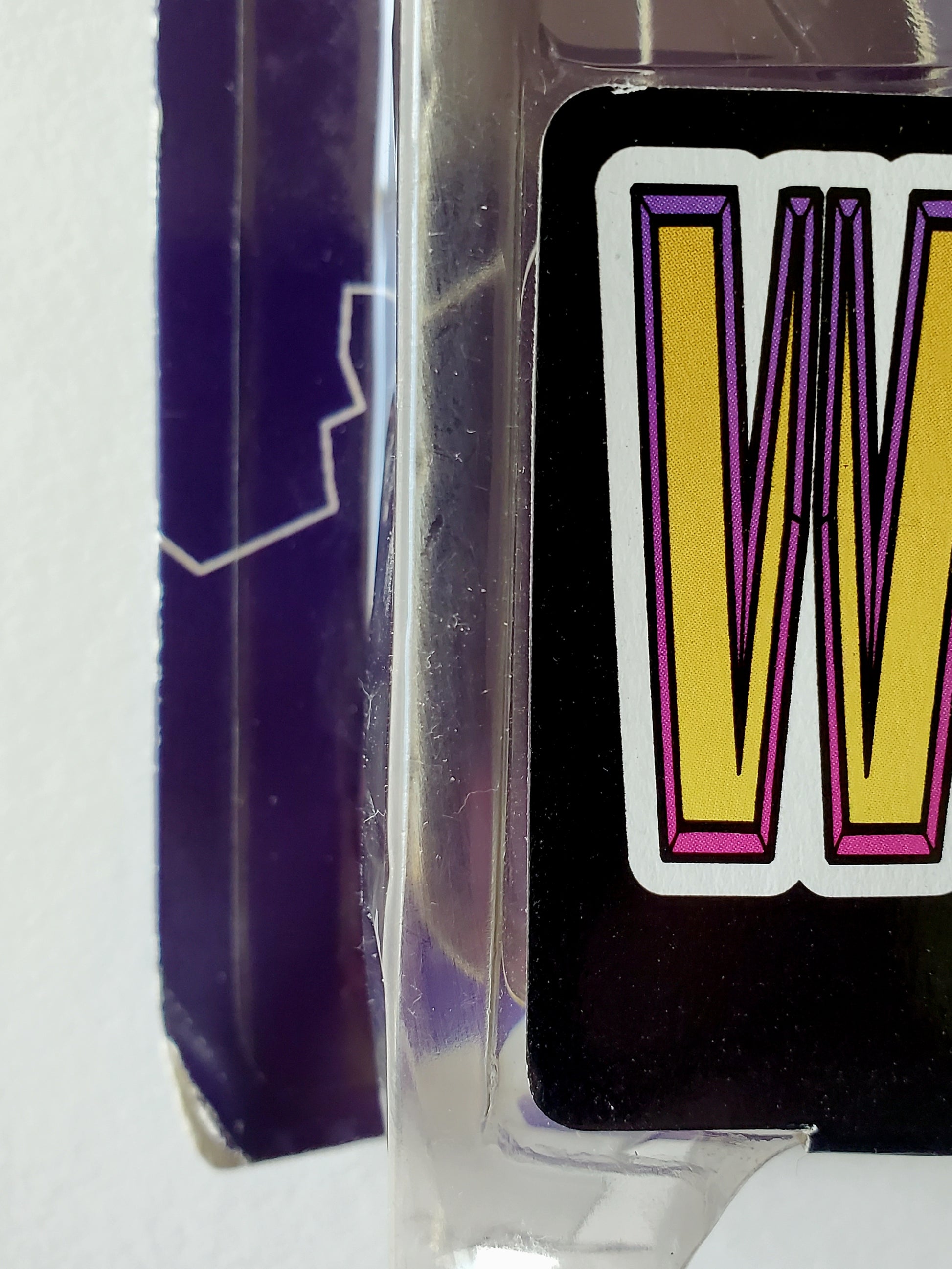 This is the black costumed variant. The figure is new in a package with small dents on the bottom and bumps on the corners. The blister tray has a yellow tint due to age.